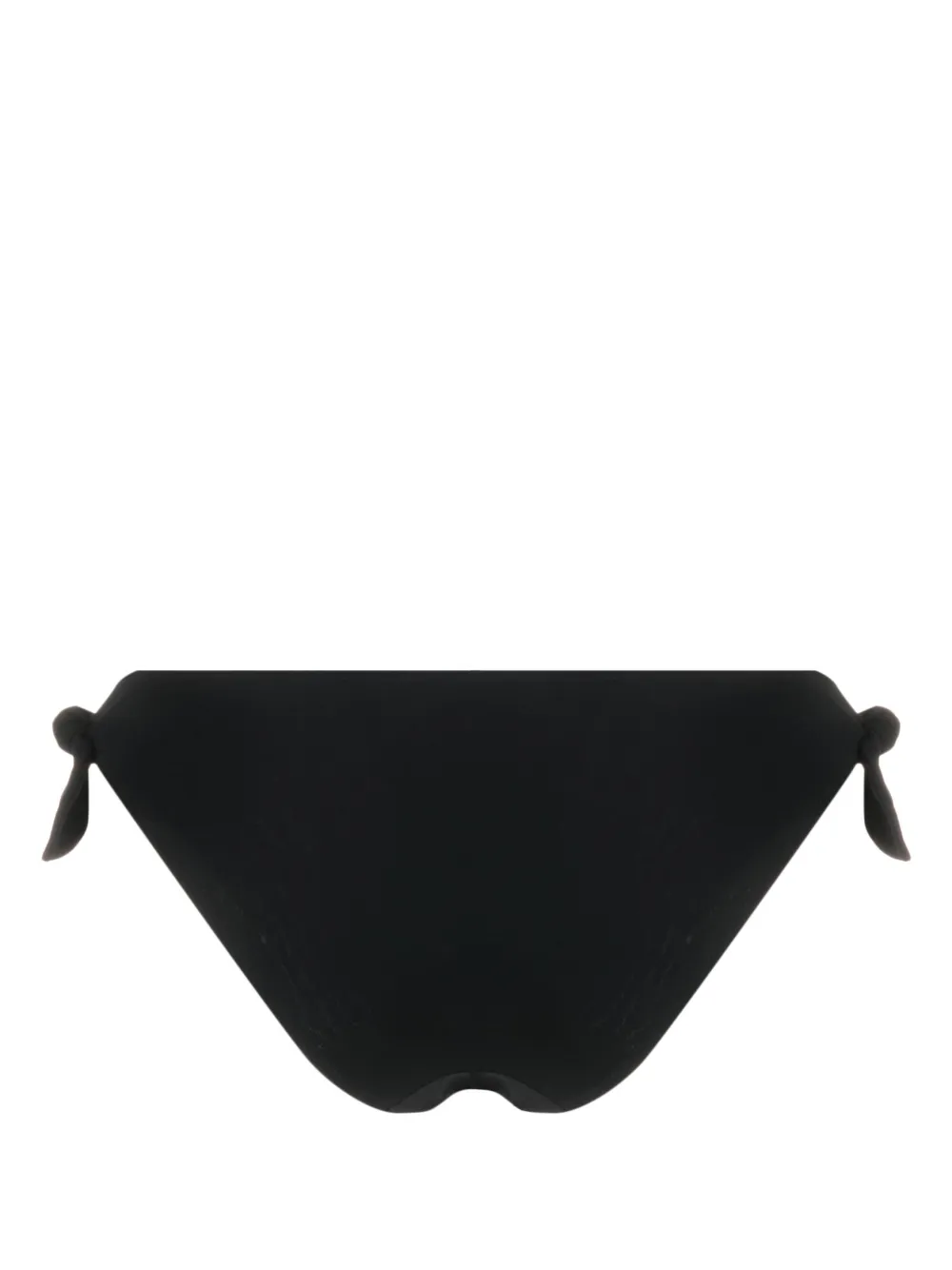 Черный, эластичный материал, золотистый металлический логотип и завязки по бокам. Пожалуйста, примеряйте купальники и пляжные шорты только поверх собственного белья.