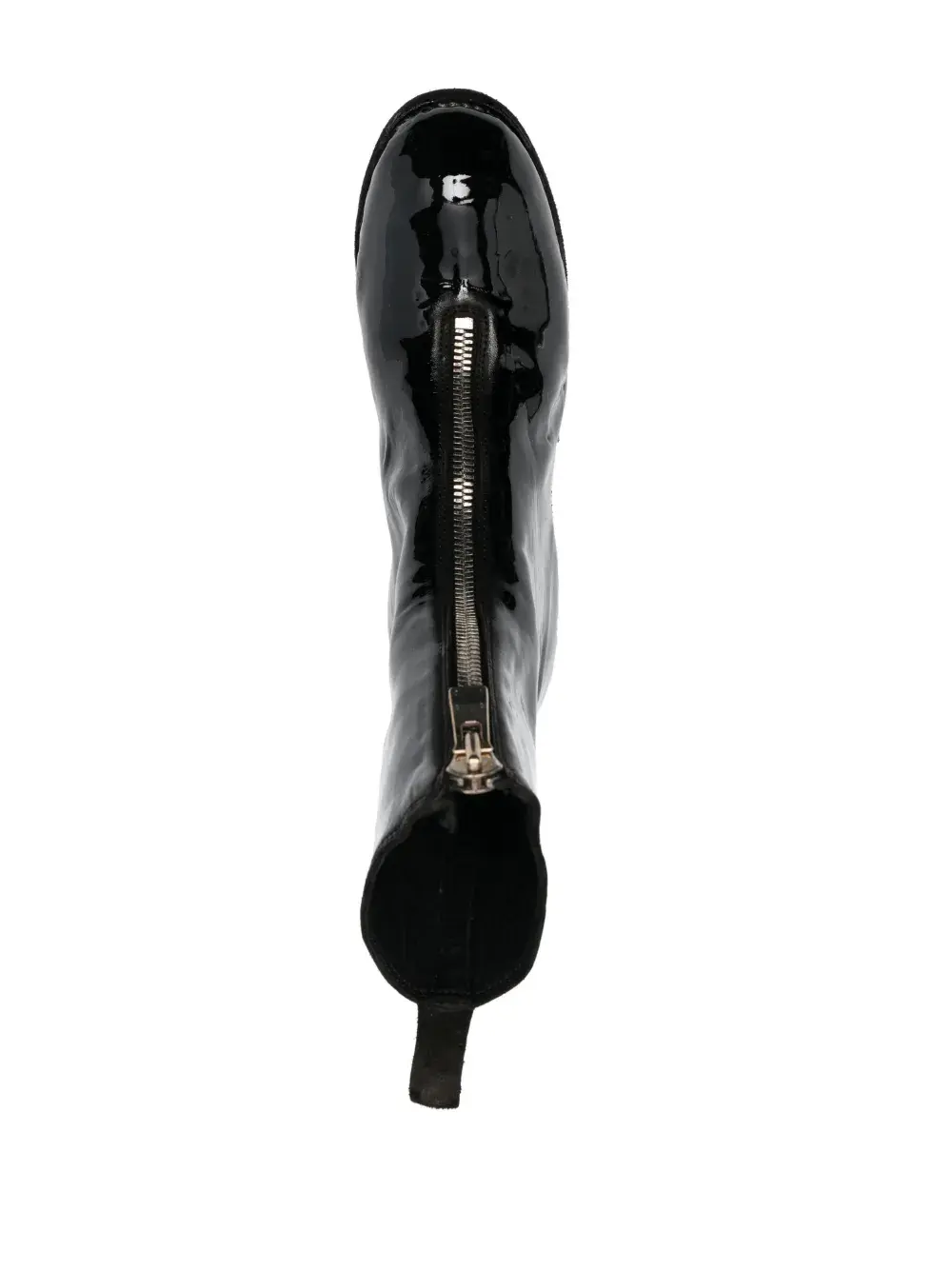 Черный, телячья кожа, ламинированное покрытие, высота по щиколотку, петля для подтягивания сзади, застежка на молнии спереди, закругленный носок и низкий блочный каблук. Это унисекс-модель. Обратите внимание, что для нее используется мужская размерная сетка.