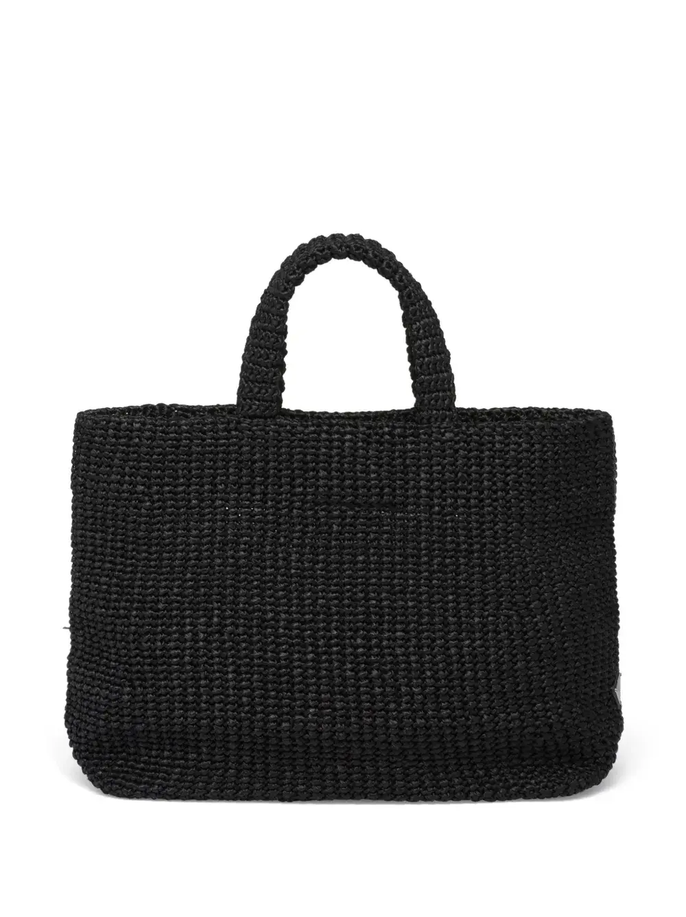Черный, плетеный дизайн из рафии, вышитый логотип спереди, две верхние ручки, дизайн с открытым верхом и основное отделение.