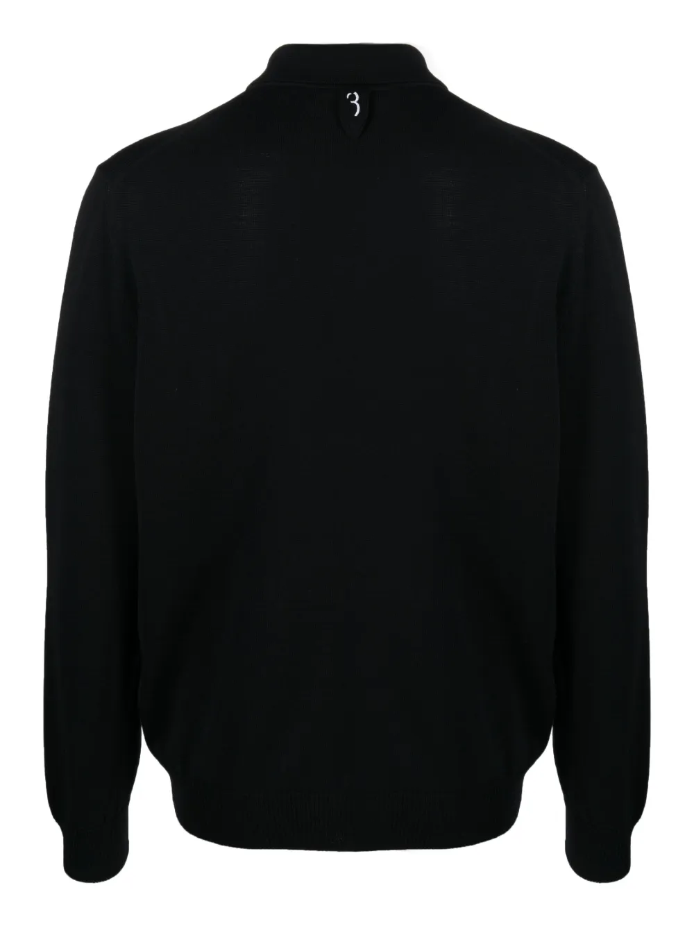 Черный, смесовая шерсть мериноса, трикотажный материал, монограмма, воротник поло, длинные рукава и вязаные края в рубчик.