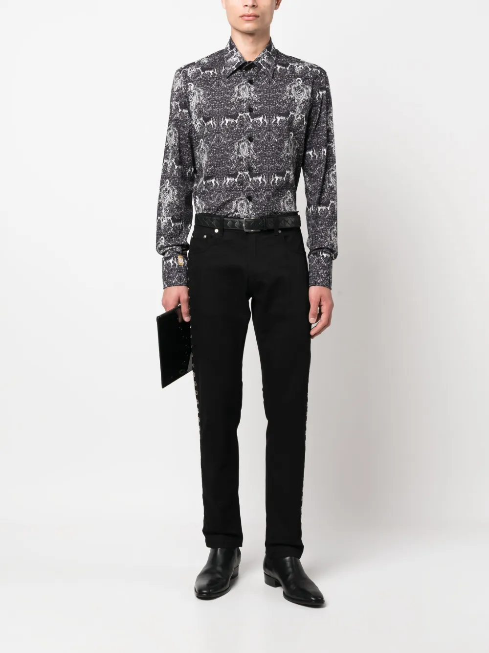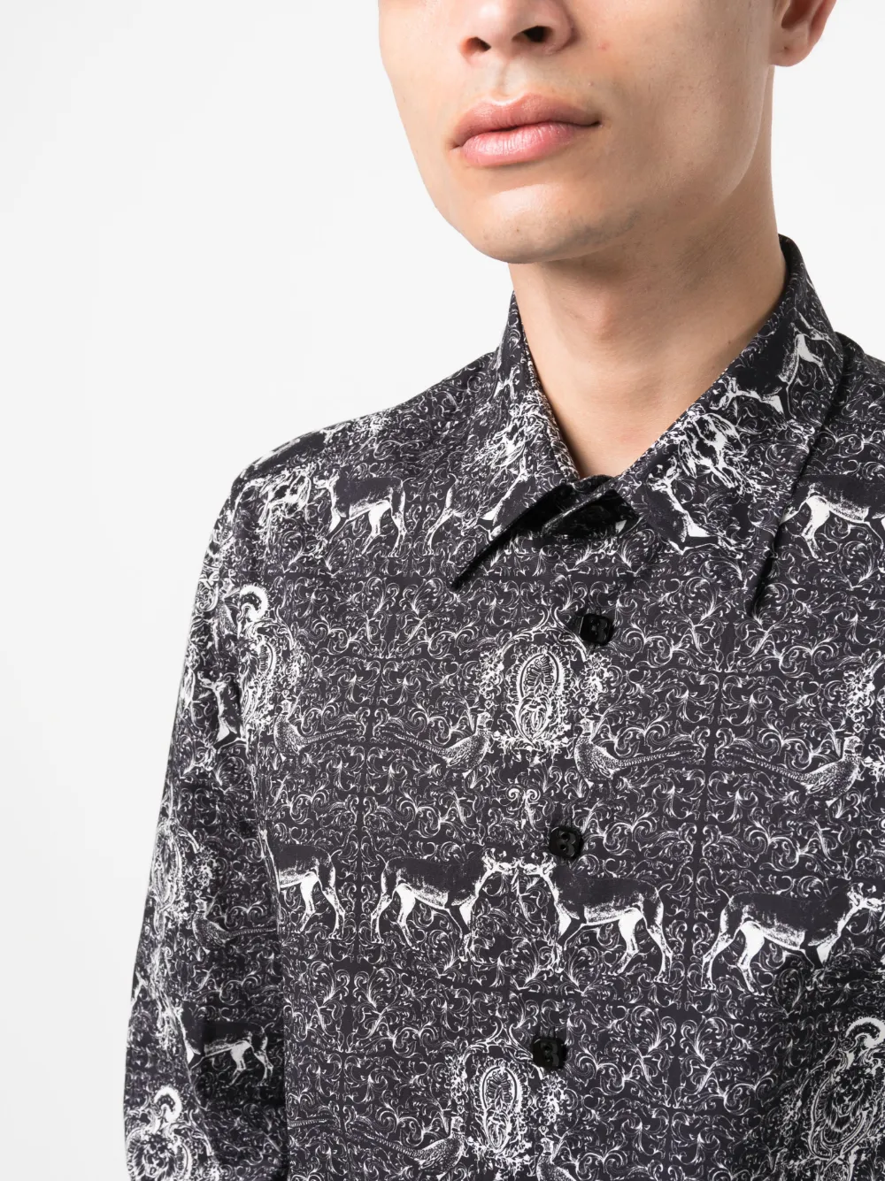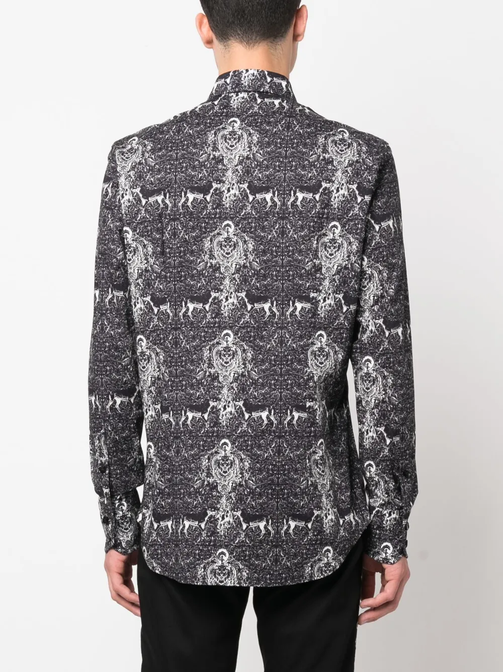 Черный/белый, эластичный хлопок, узор с изображением монограммы, сплошной графичный принт, классический воротник, застежка на пуговицах спереди, длинные рукава, манжеты на пуговицах и закругленный подол.
