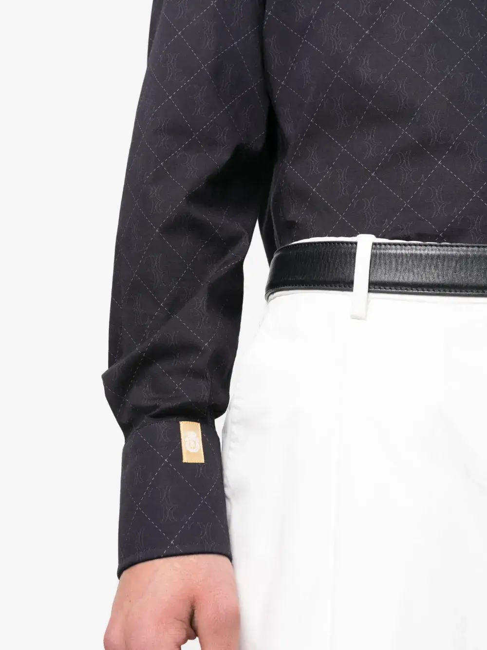 Черный, эластичный хлопок, монограмма, классический воротник, застежка на пуговицах спереди, длинные рукава, манжеты на пуговицах и закругленный подол.