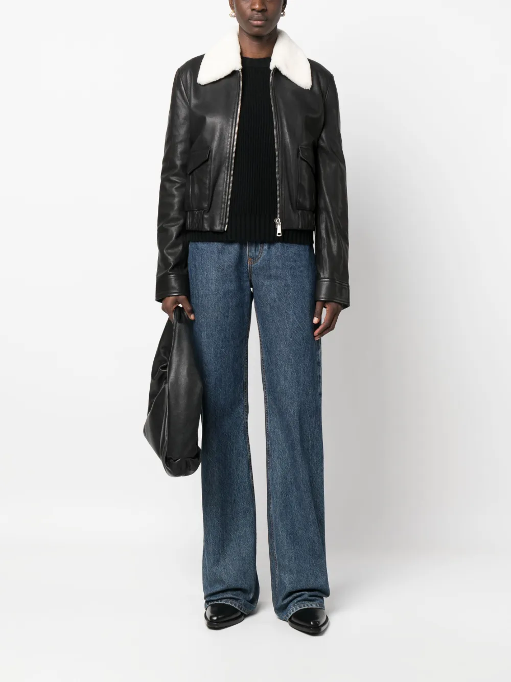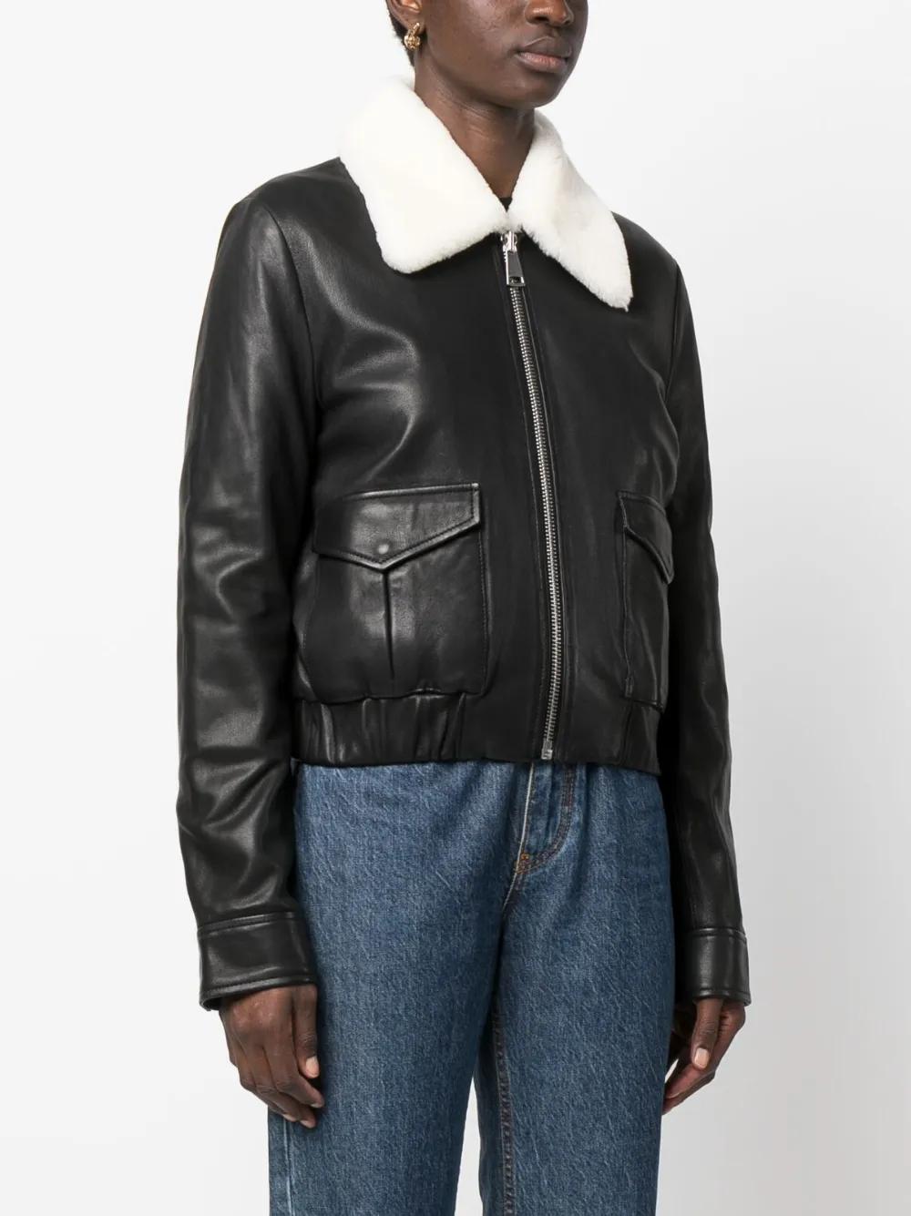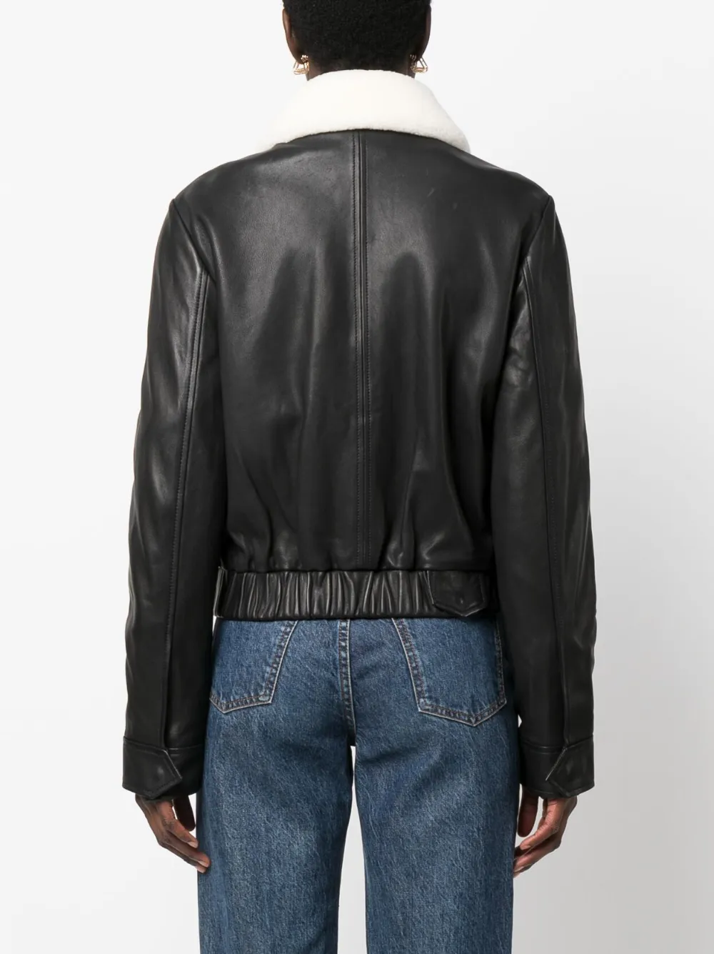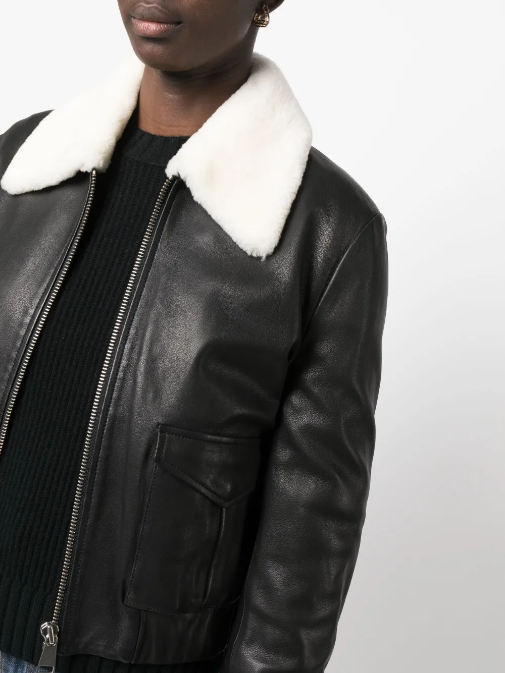 Черный/белый, кожа, воротник из овечьей шерсти, застежка на молнии спереди, два передних кармана с клапанами, длинные рукава, манжеты на пуговицах, укороченная длина, эластичный подол и прямой подол.
