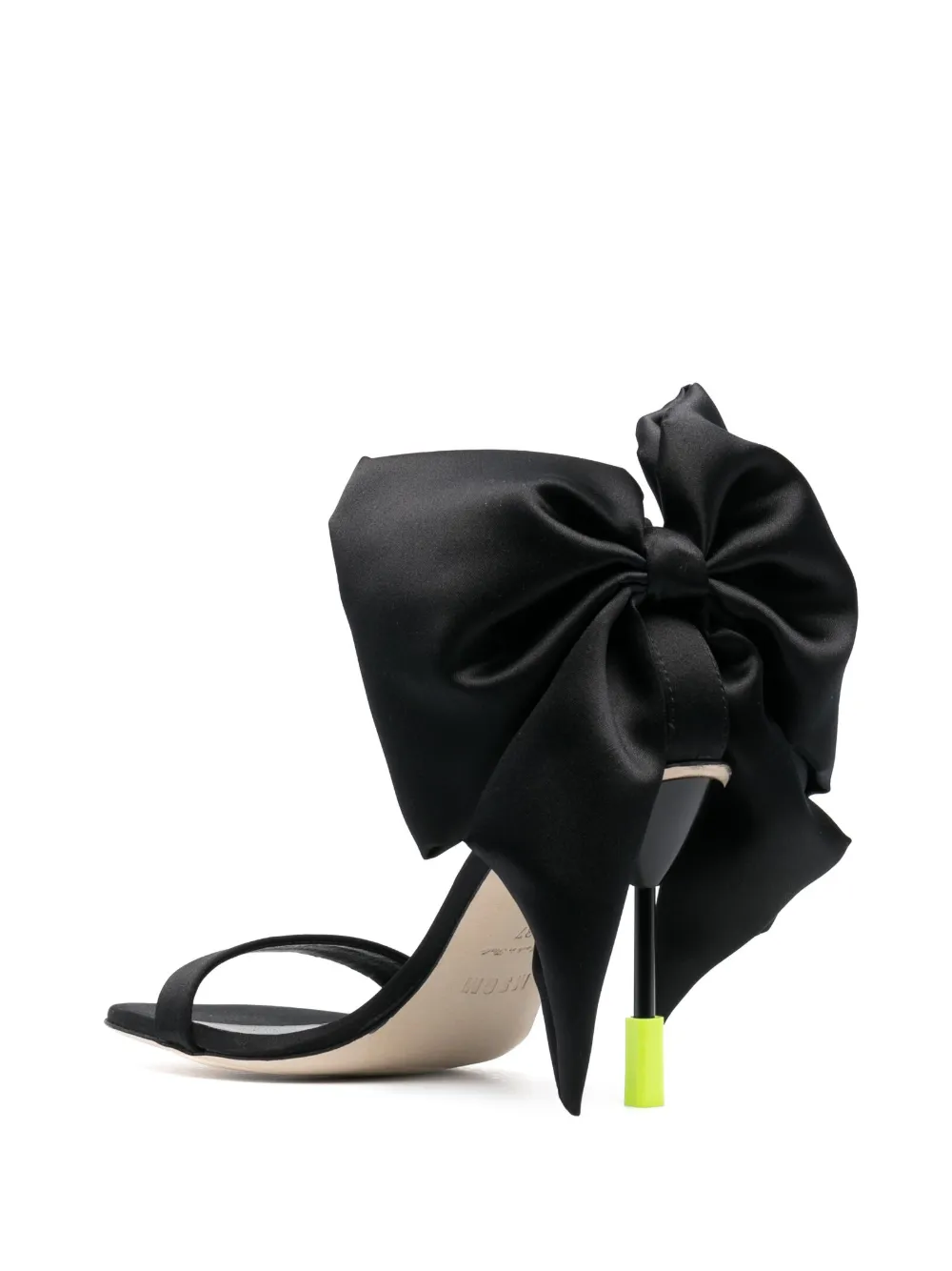Черный, флуоресцентный зеленый, телячья кожа, сатиновая фактура, крупный бант, кожаная стелька с логотипом, открытый носок и ремешок на щиколотке с пряжкой.