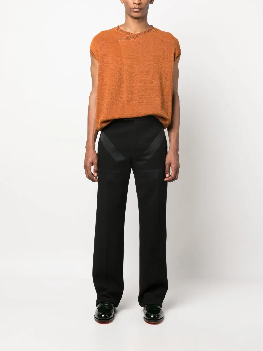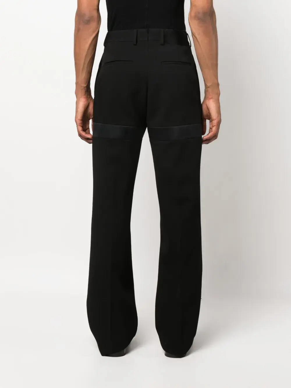 Черный, необработанная шерсть, атласная отделка, строгий крой, стрелки, завышенная талия, петли для ремня, потайная застежка спереди и два кармана с листочкой сзади.