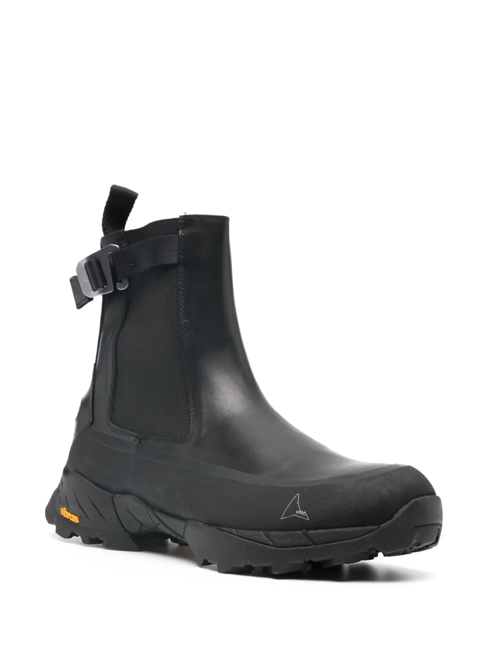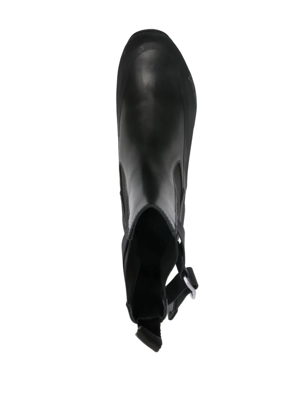 Черный, телячья кожа, гладкая текстура кожи, логотип сбоку, логотип на подошве, строчка в тон, регулируемый ремень сбоку, петля для подтягивания сзади, закругленный носок, модель без застежки, эластичные боковые вставки, стелька с логотипом, блочный каблук средней высоты и рифленая резиновая подошва.