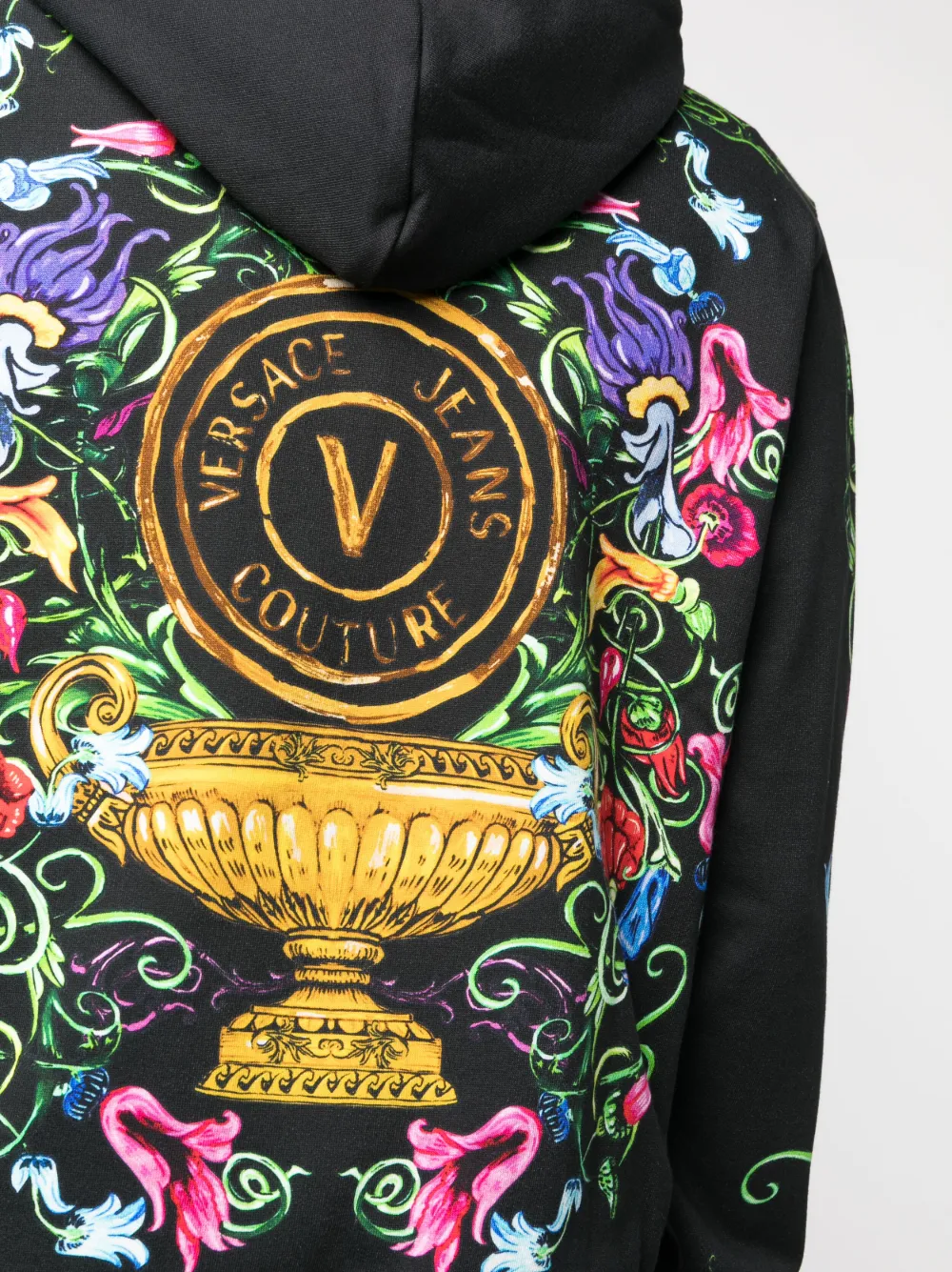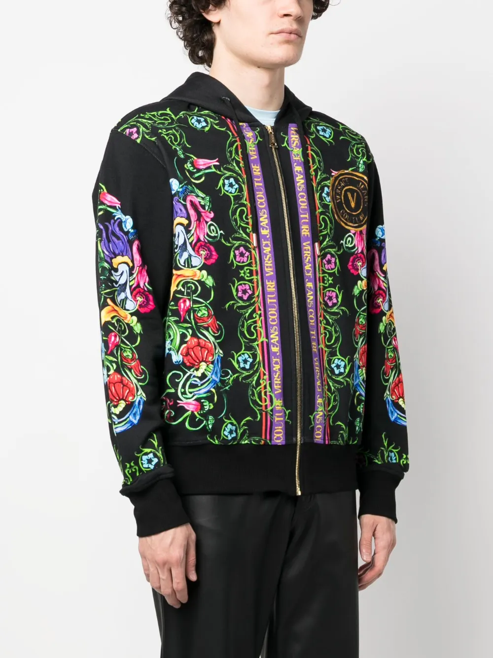 Черный/разноцветный, хлопок, сплошной цветочный принт, узор в стиле барокко, затягивающийся на шнурок капюшон, застежка на молнии спереди и длинные рукава.