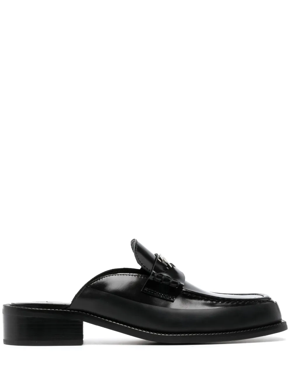 Черный, телячья кожа, серебристый металлический логотип, прорези на язычке, квадратный носок, модель без застежки, низкий блочный каблук и кожаная стелька с логотипом.