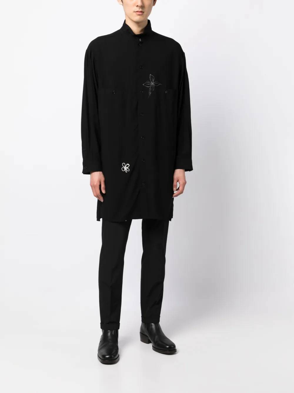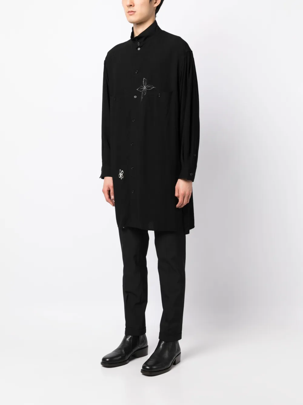 Черный, цветочная деталь, классический воротник, планка на пуговицах спереди, длинные рукава, манжеты на пуговицах, прямой подол и длина до бедер.