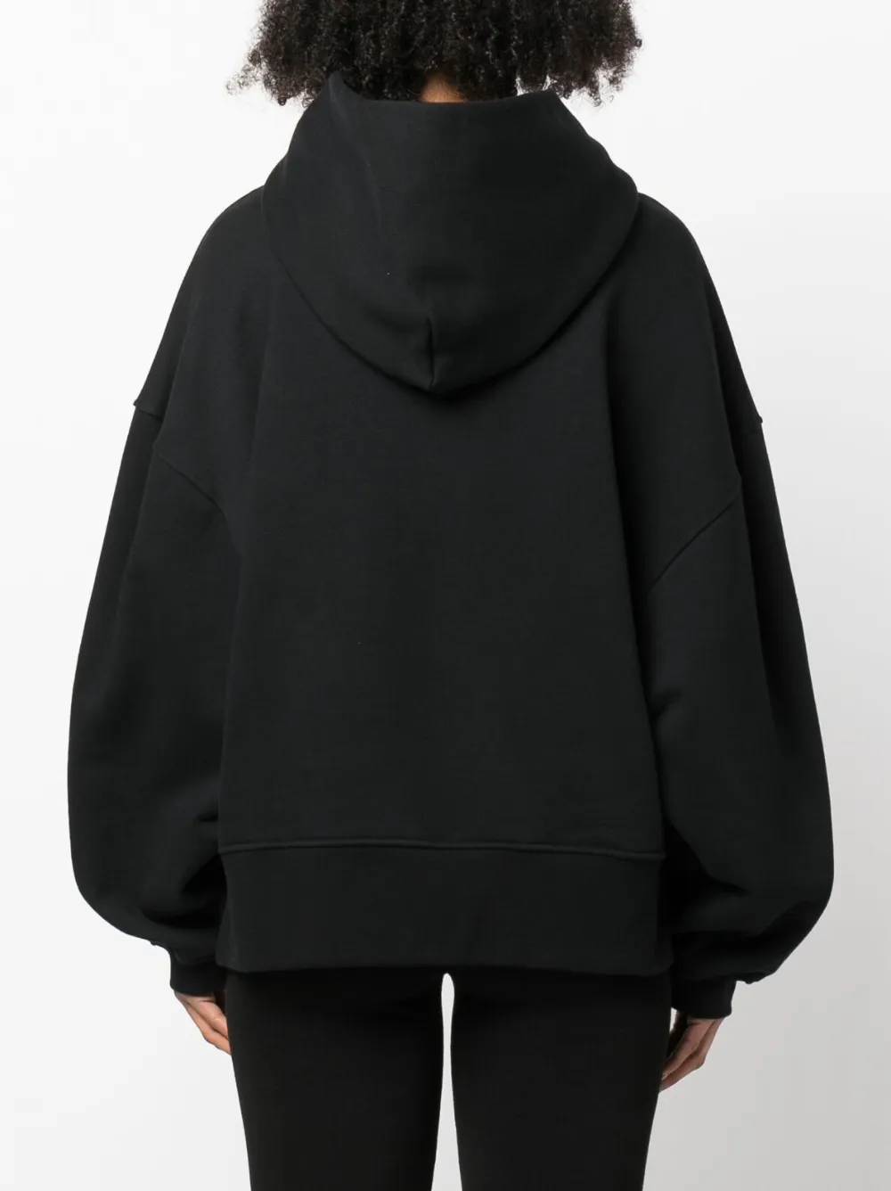 Черный, хлопок, логотип спереди, объемные рукава, прямой подол, объемный капюшон и карман-муфта.