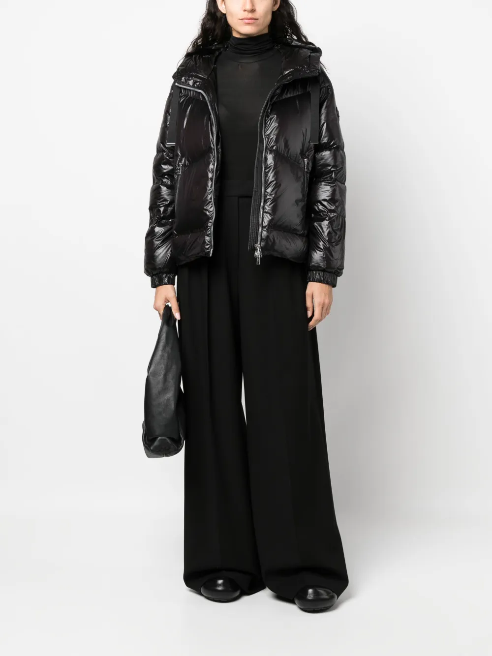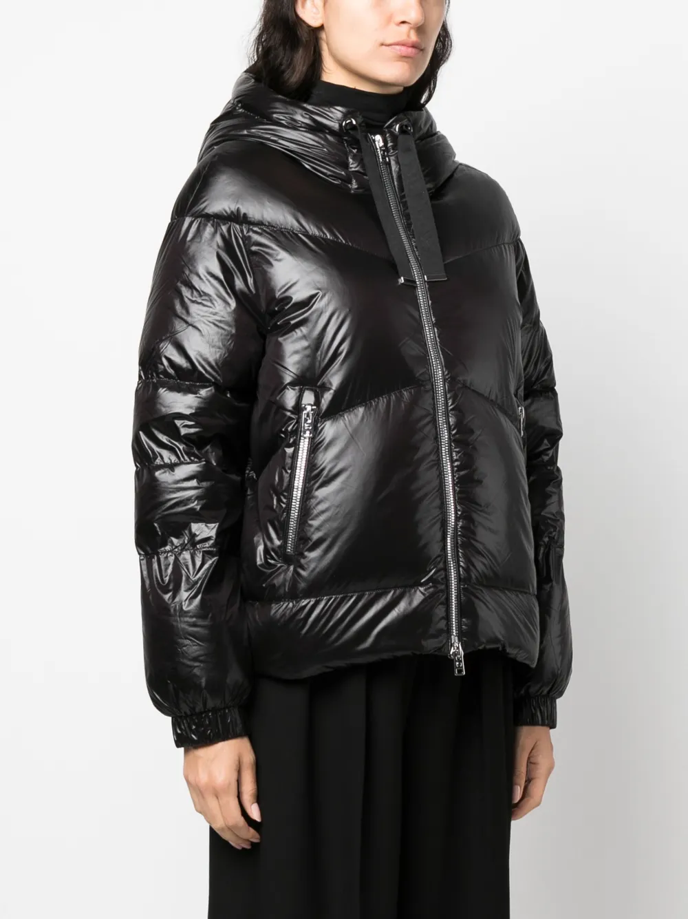 Черный, утиные перья, утиный пух, дутый материал, застежка с тисненым логотипом, классический капюшон, застежка на молнии спереди, длинные рукава, эластичные манжеты, передние карманы на молнии и прямой подол.