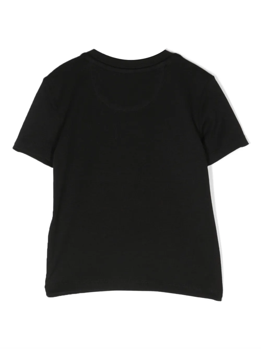 Черный, эластичный хлопок, логотип спереди, круглый вырез, короткие рукава и прямой подол.