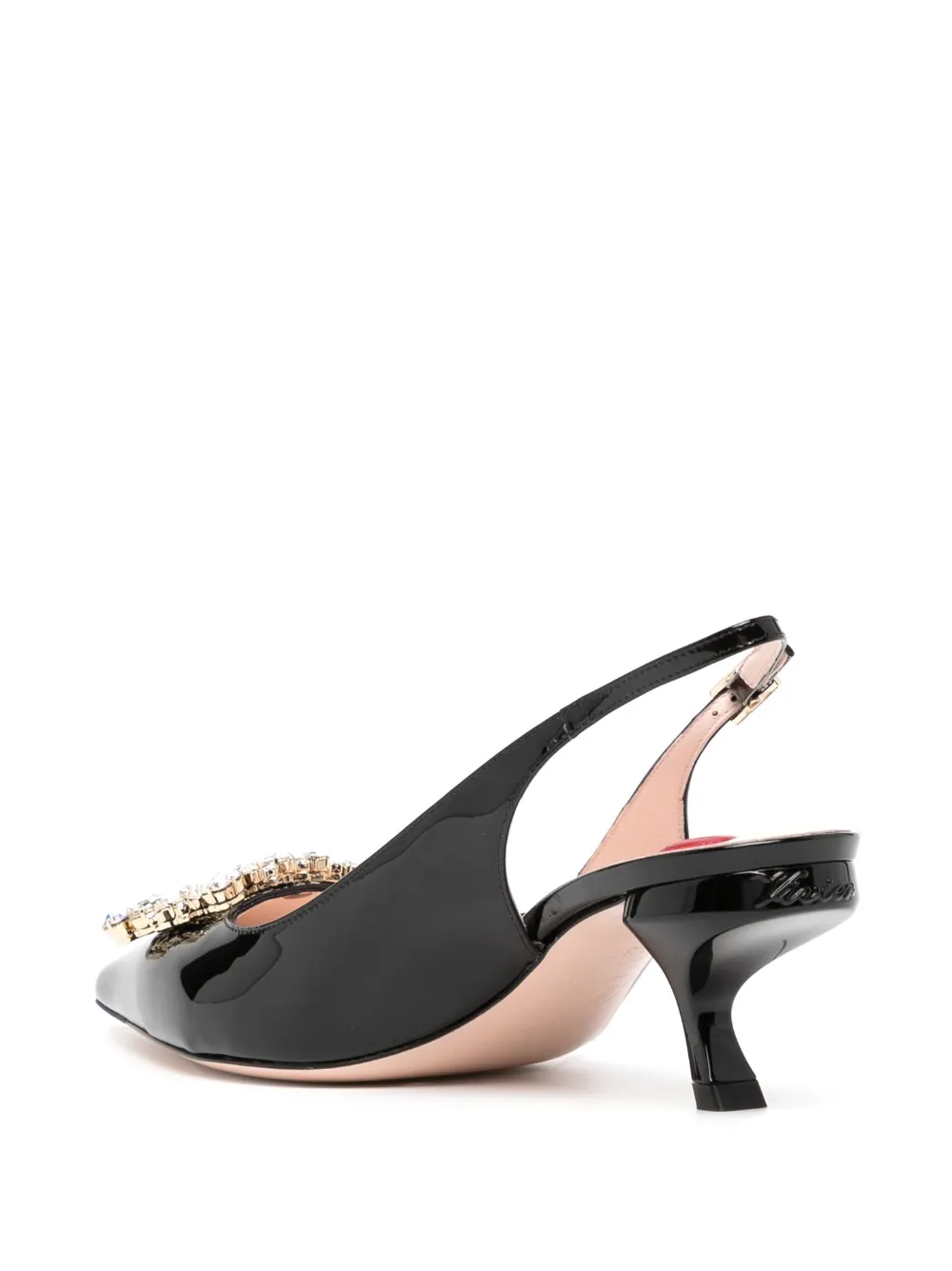 Черный, телячья кожа, лакированная отделка, пряжка с кристаллами, заостренный носок, ремешок на пятке с пряжкой, кожаная стелька с логотипом и каблук средней высоты.
