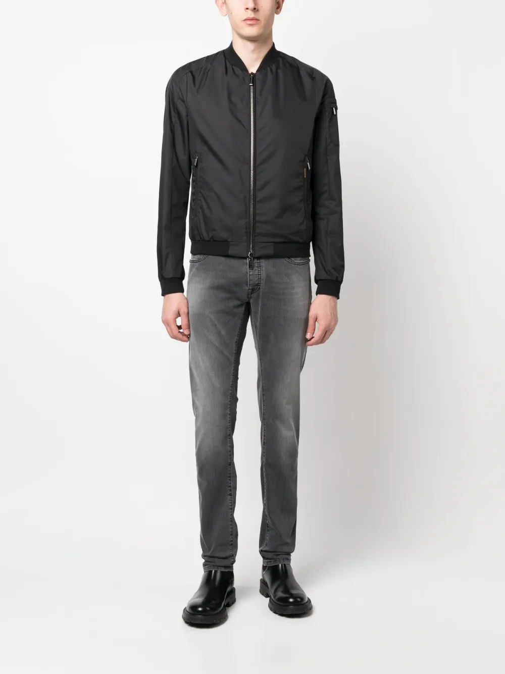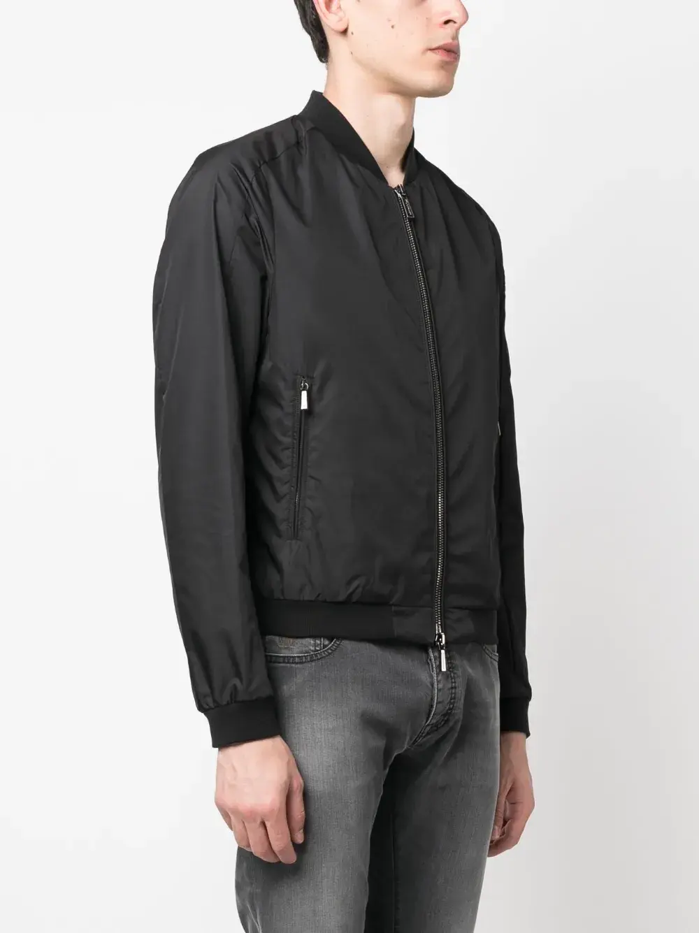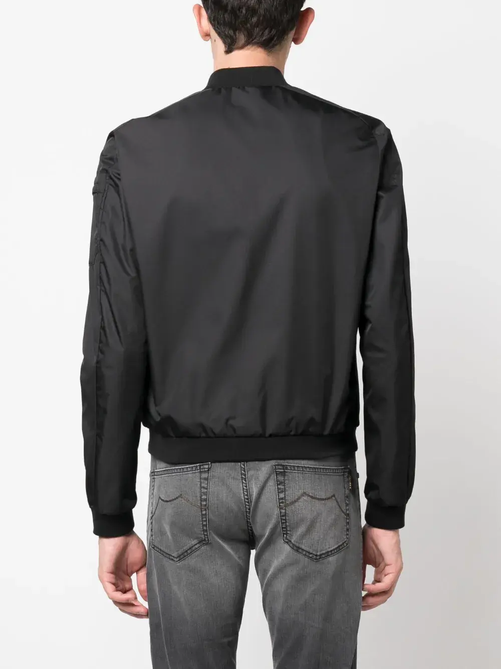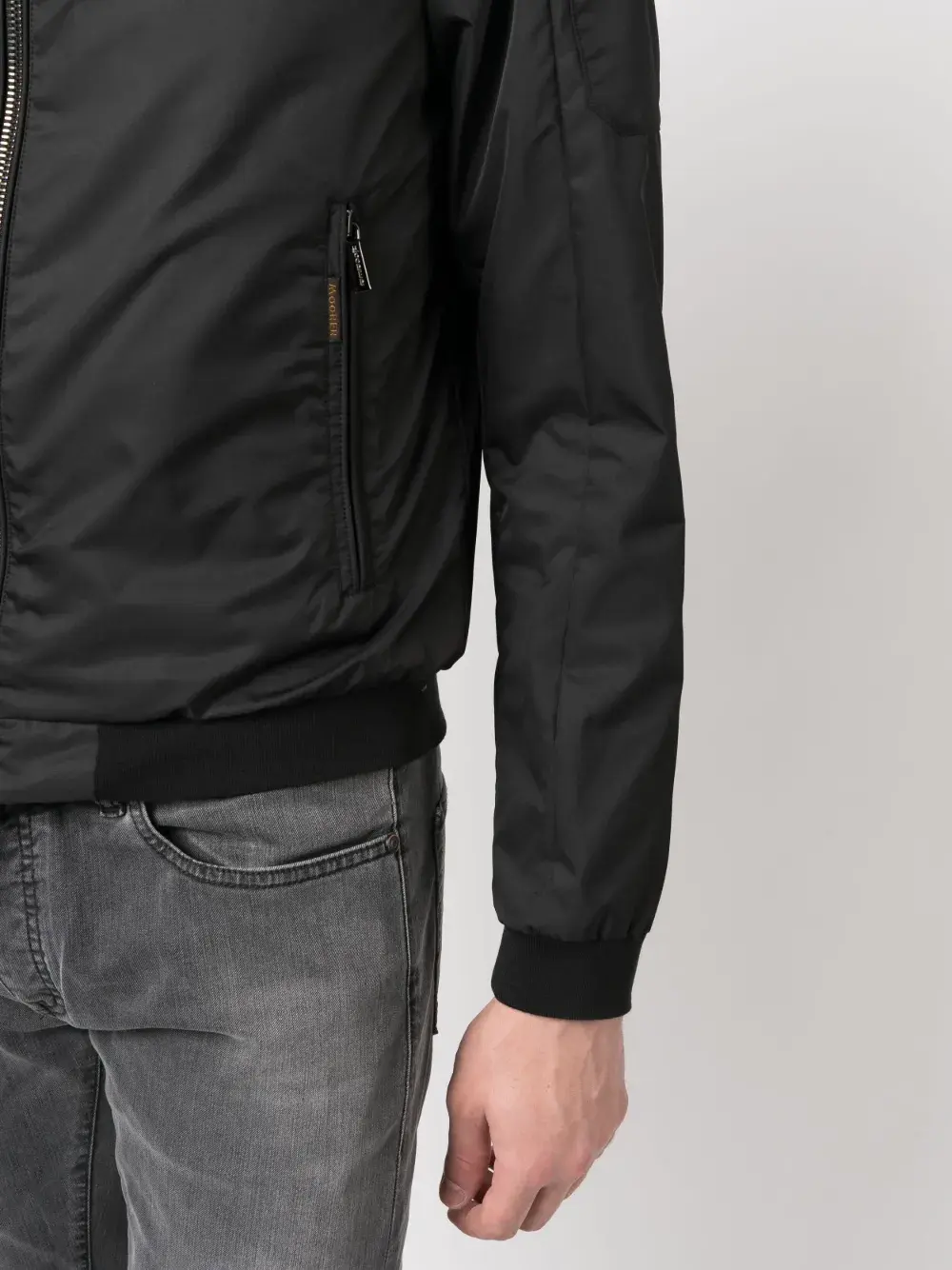 Черный, маленькая подвеска с логотипом, воротник-стойка в рубчик, двусторонняя молния спереди, длинные рукава, манжеты в рубчик, два кармана на молнии по бокам, карман с молнией на рукаве, подол в рубчик и прямой подол.