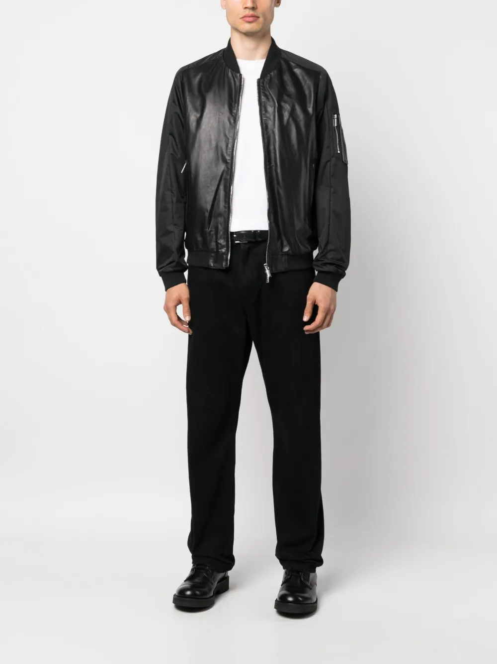 Черный, кожа наппа, глянцевая фактура, дутый материал, воротник-стойка в рубчик, двусторонняя молния спереди, два кармана на молнии по бокам, длинные рукава, карман с молнией на рукаве и внутренние карманы на молнии.