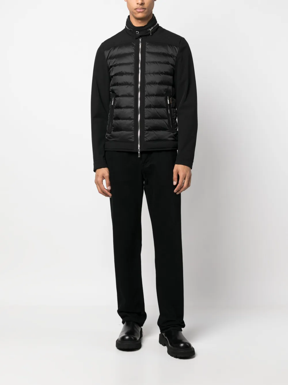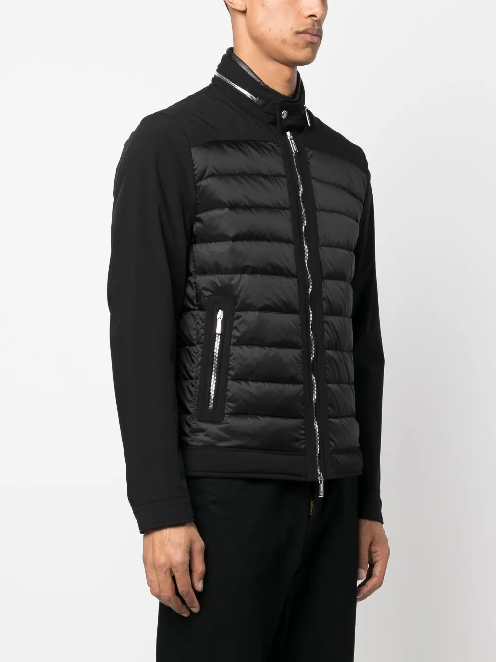 Черный, дутый материал, наполнитель из смеси пуха и пера, воротник-труба, потайной капюшон, застежка на молнии спереди, два кармана на молнии по бокам, длинные рукава и контрастные рукава.