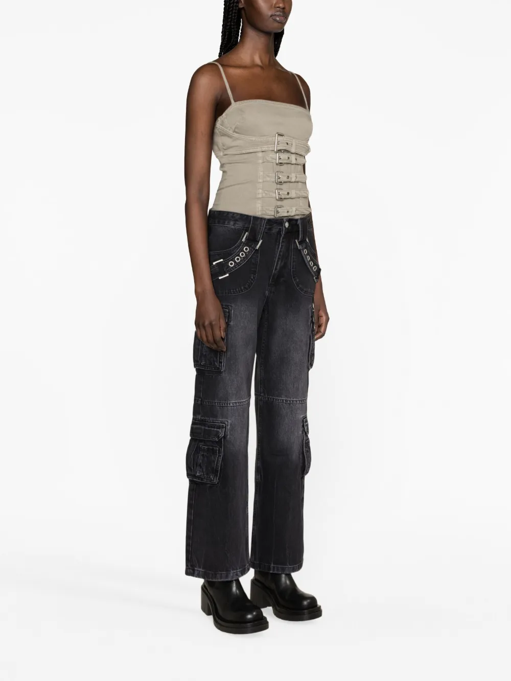Подробнее о товаре: Черный, смесовый органический хлопок, деним, ремешки, серебристая фурнитура, петли для ремня, потайная застежка на молнии и пуговицах, два кармана по бокам, два кармана с клапанами сзади, накладные карманы и широкий крой. Узнать больше о том, какие товары получают отметку «Ответственный выбор», можно из материала «Как мы оцениваем экологичность и этичность».
