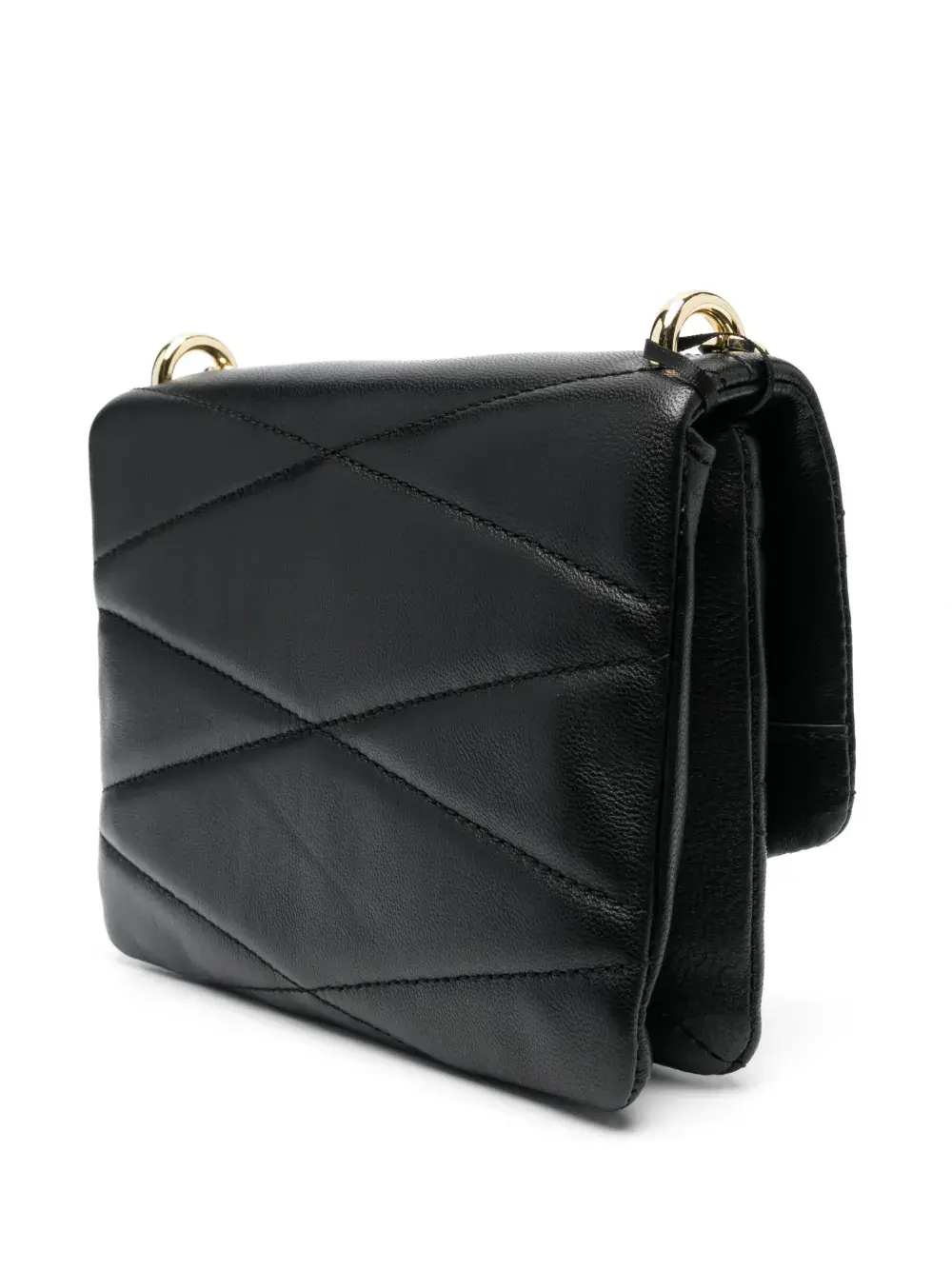 Черный, телячья кожа, стеганая модель, золотистый металлический логотип, откидной клапан на магните, съемный ремень из кожи и металла и основное отделение.