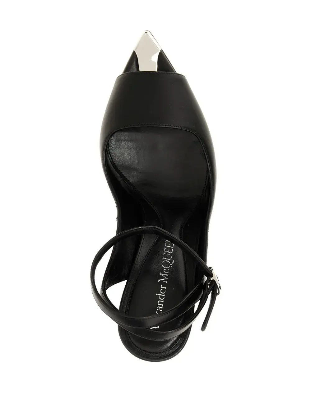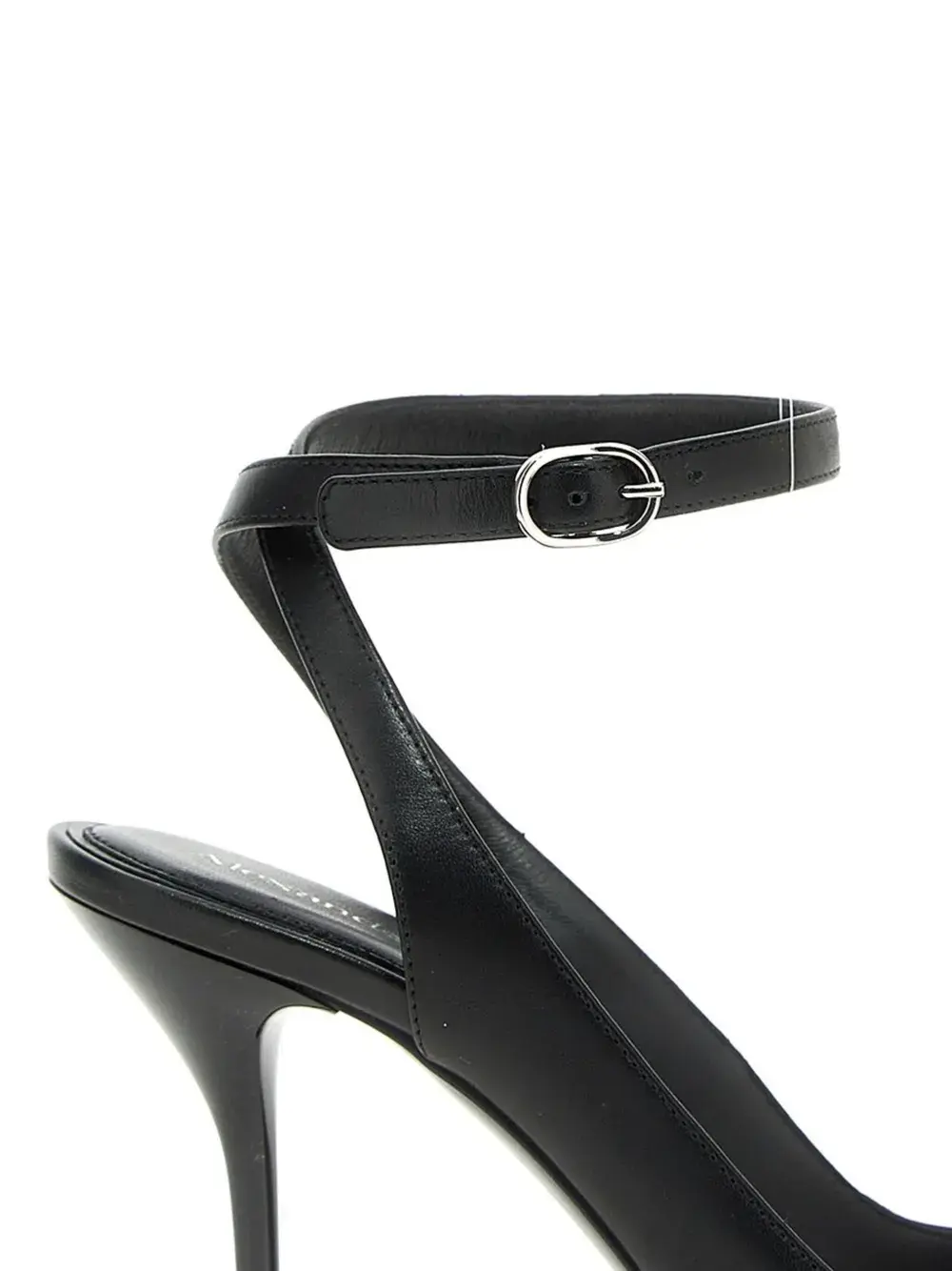 Черный, телячья кожа, логотип на стельке, заостренный носок, открытый носок, ремешок на щиколотке с пряжкой, ремешок на палец, каблук на высокой шпильке и носок с металлической накладкой.