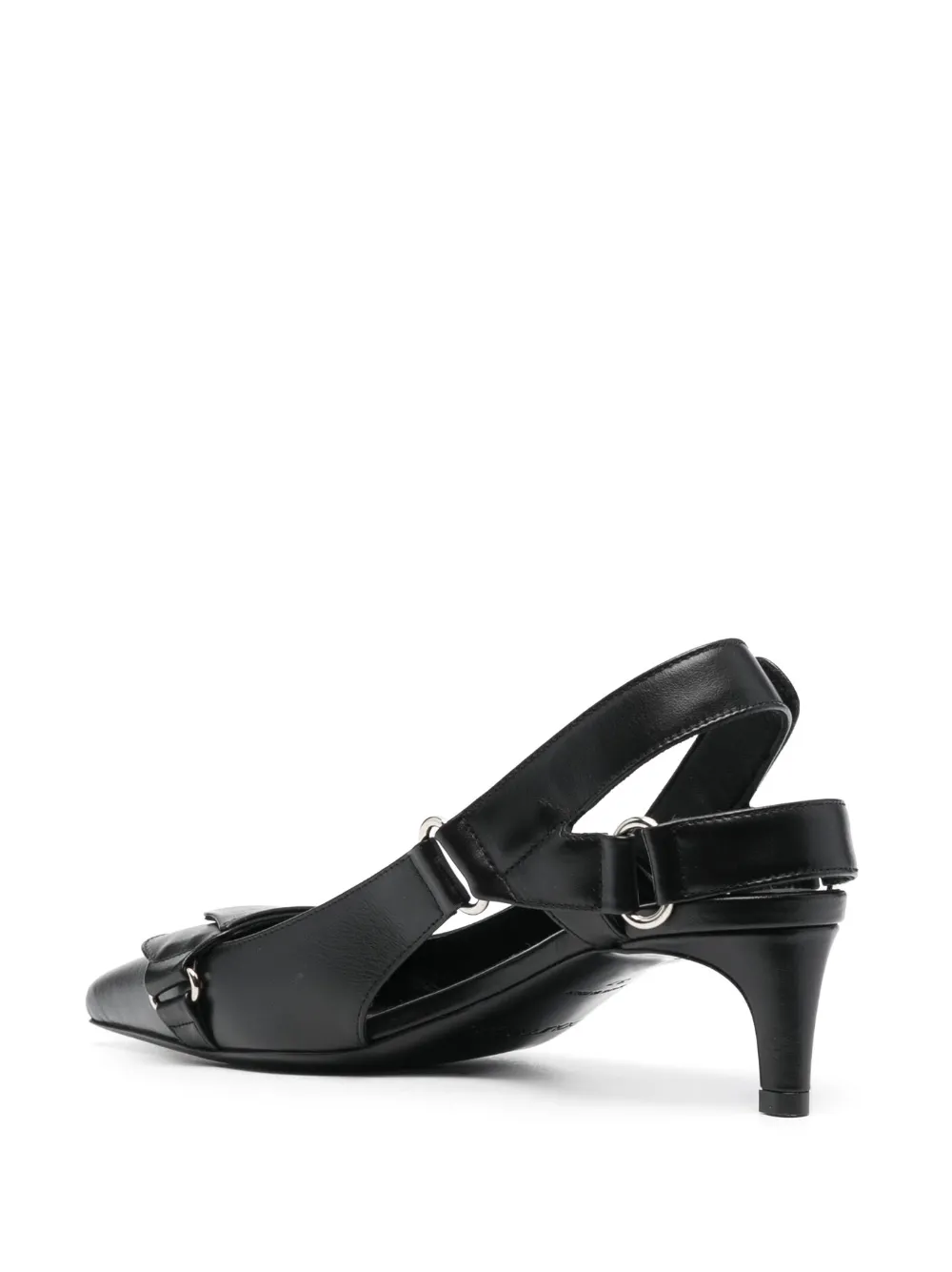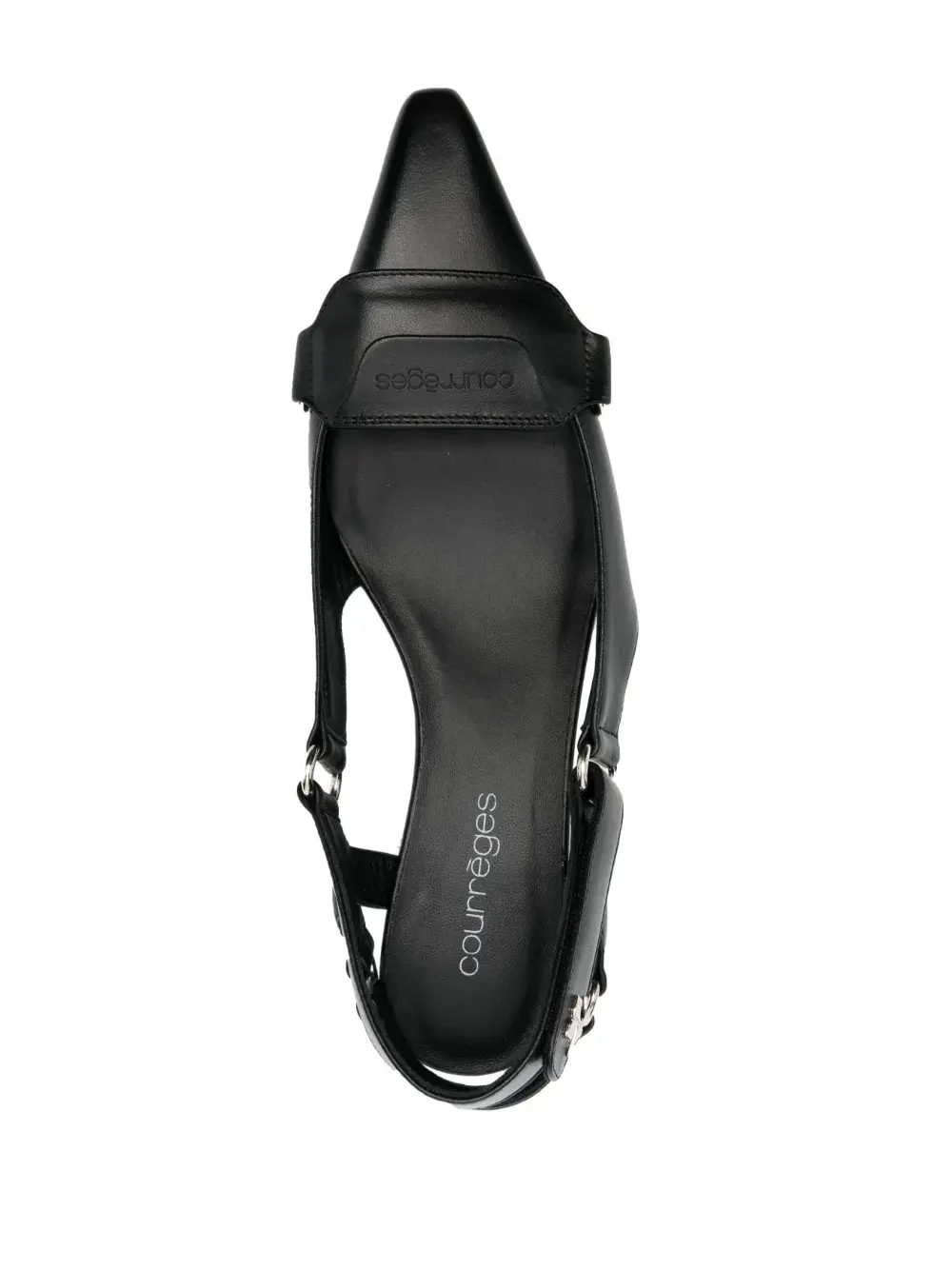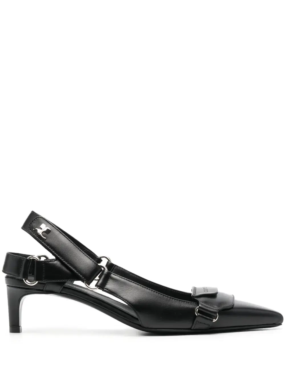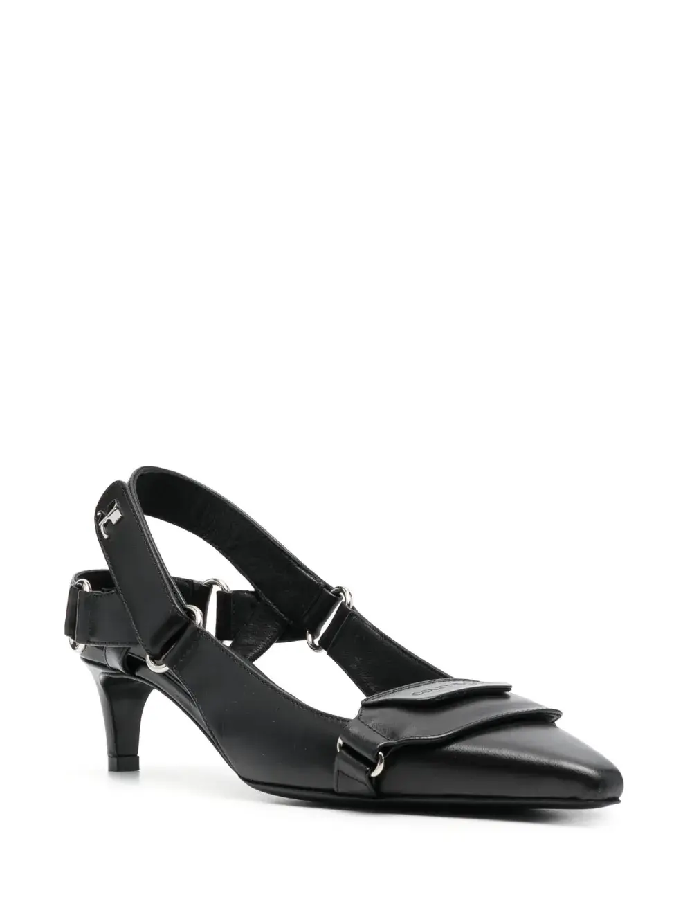 Черный, телячья кожа, тисненый логотип спереди, заостренный носок, ремешок на пятке и каблук-рюмка.