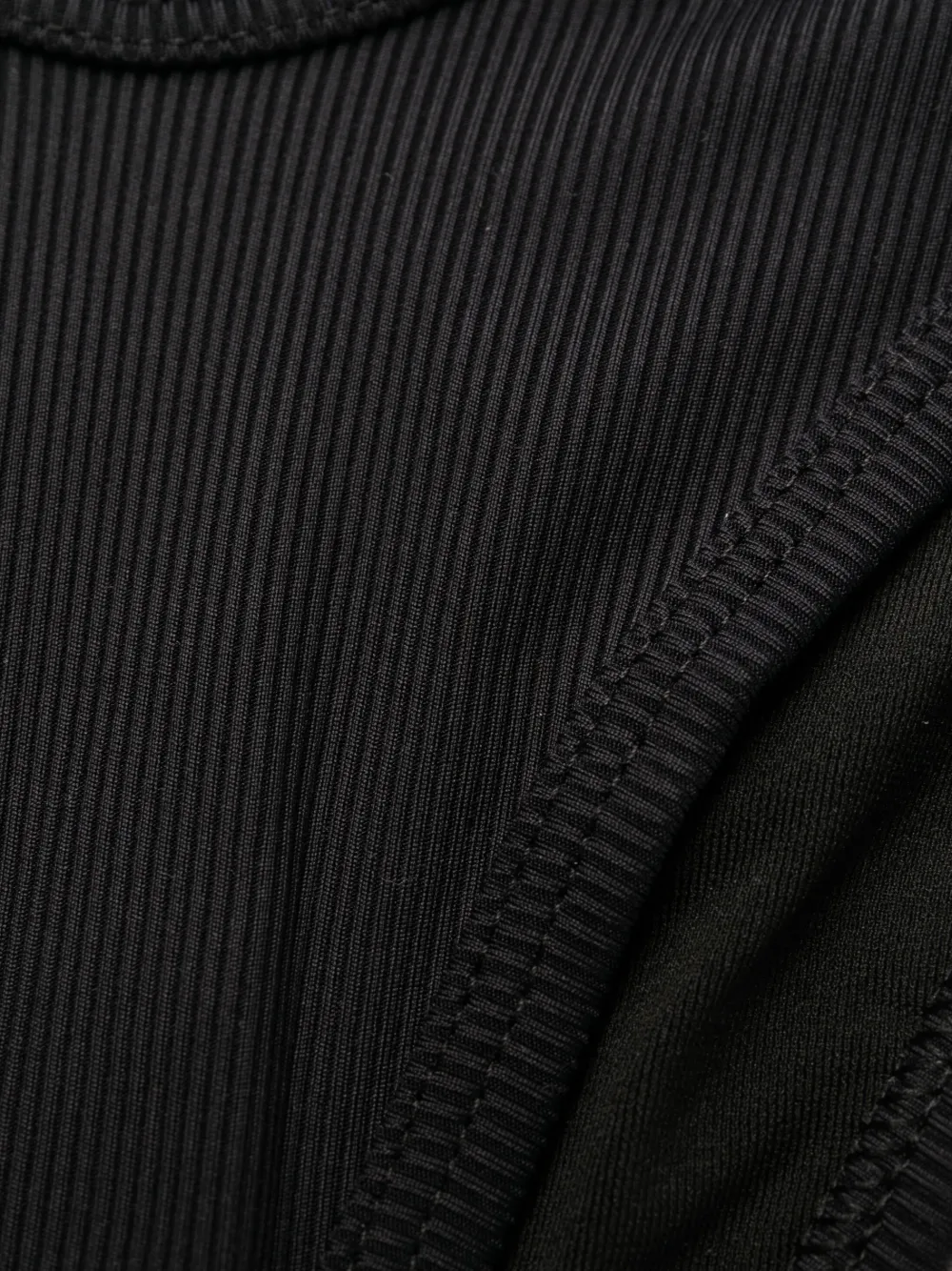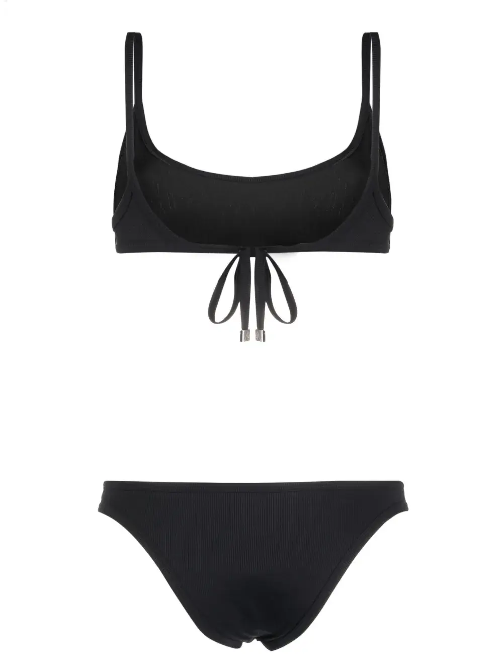 Черный, эластичный материал, ткань в мелкий рубчик, квадратный вырез, тонкие бретели, застежка на завязке сзади и классические плавки бикини. Пожалуйста, примеряйте купальники и пляжные шорты только поверх собственного белья.