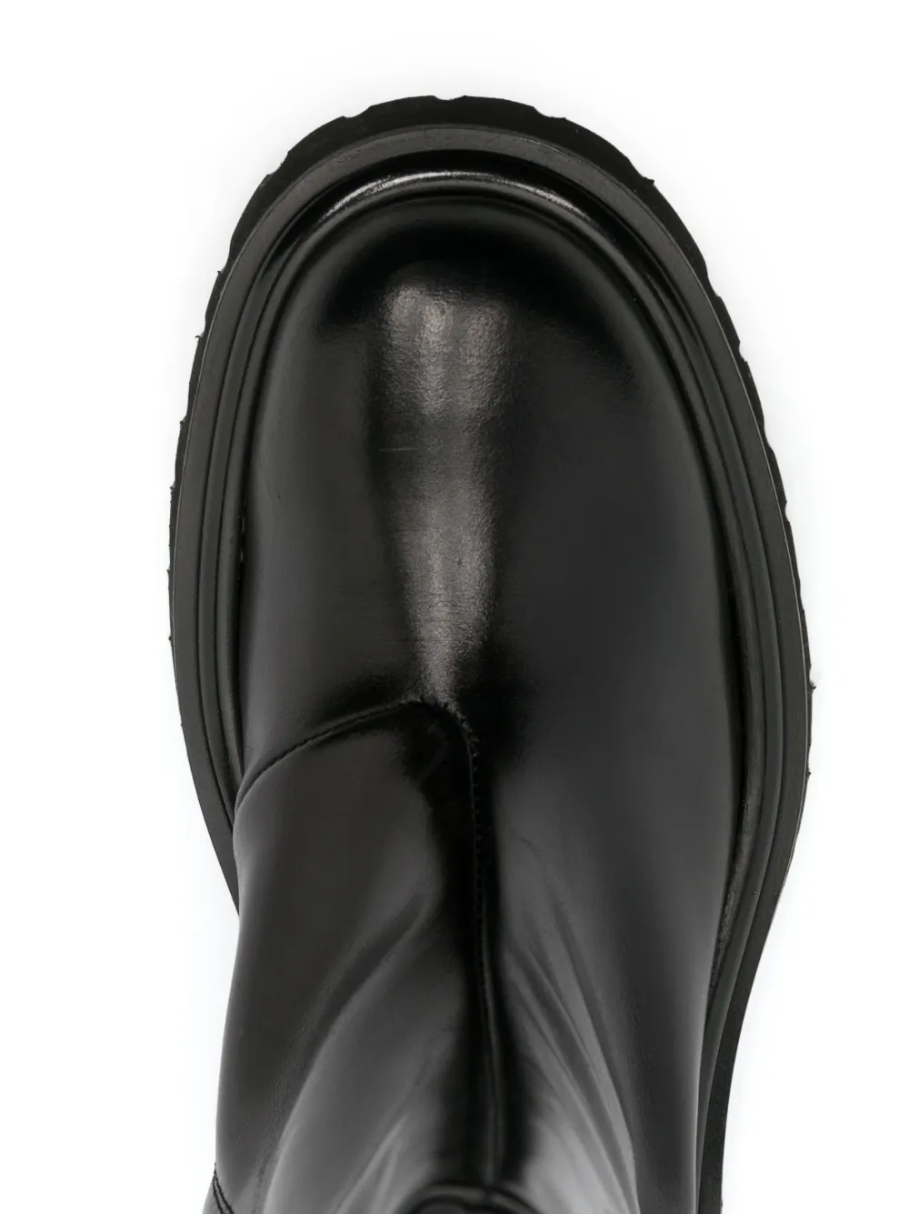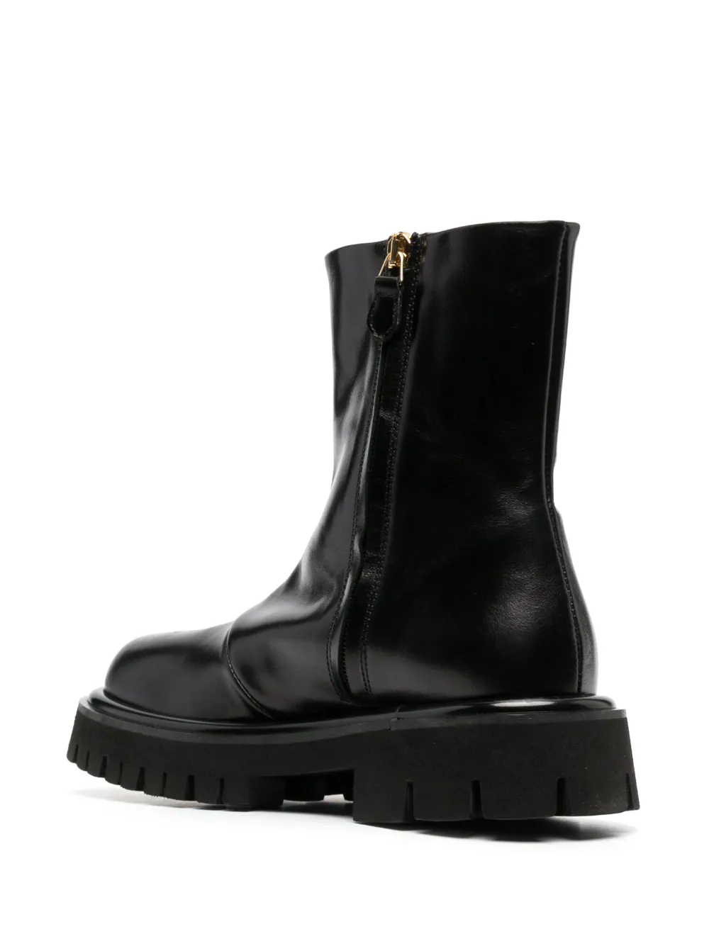 Черный, телячья кожа, глянцевое покрытие, тисненый логотип сбоку, строчка в тон, закругленный носок, застежка на молнии сбоку, длина до середины голени, массивная резиновая подошва и низкий ребристый каблук.