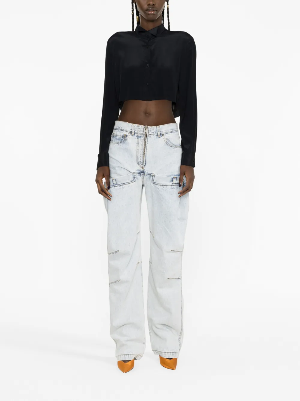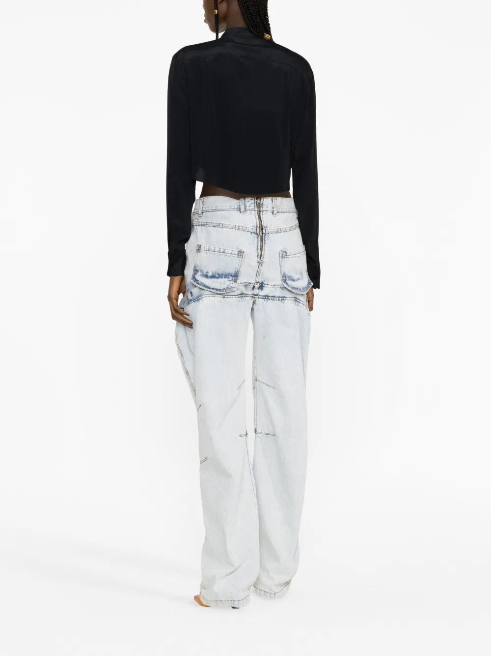 Черный, шелк, прямой воротник, застежка на пуговицах спереди, длинные рукава, манжеты на пуговицах, неравномерный подол и укороченная длина.