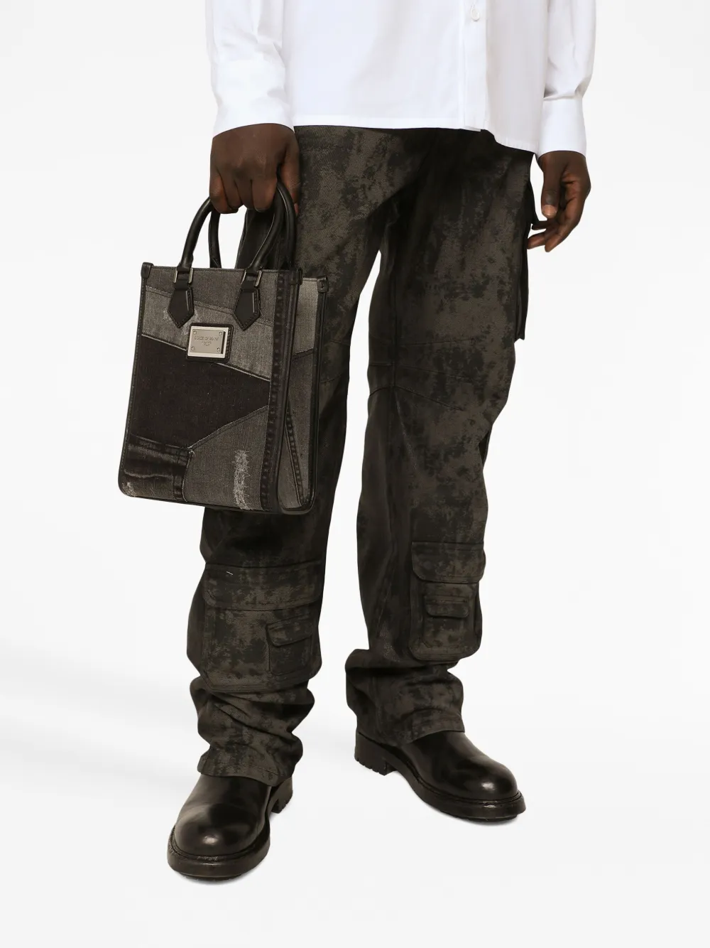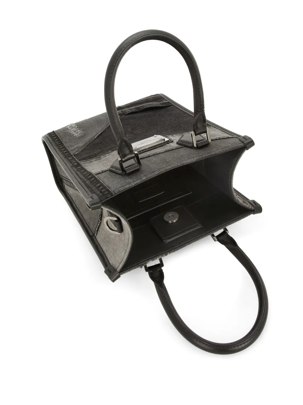 Черный, смесовый хлопок, деним в технике пэчворк, серебристый металлический логотип, короткие ручки из кожи, съемный регулируемый ремень на плечо, магнитная застежка, основное отделение, внутренний прорезной карман и нашивка с логотипом внутри.