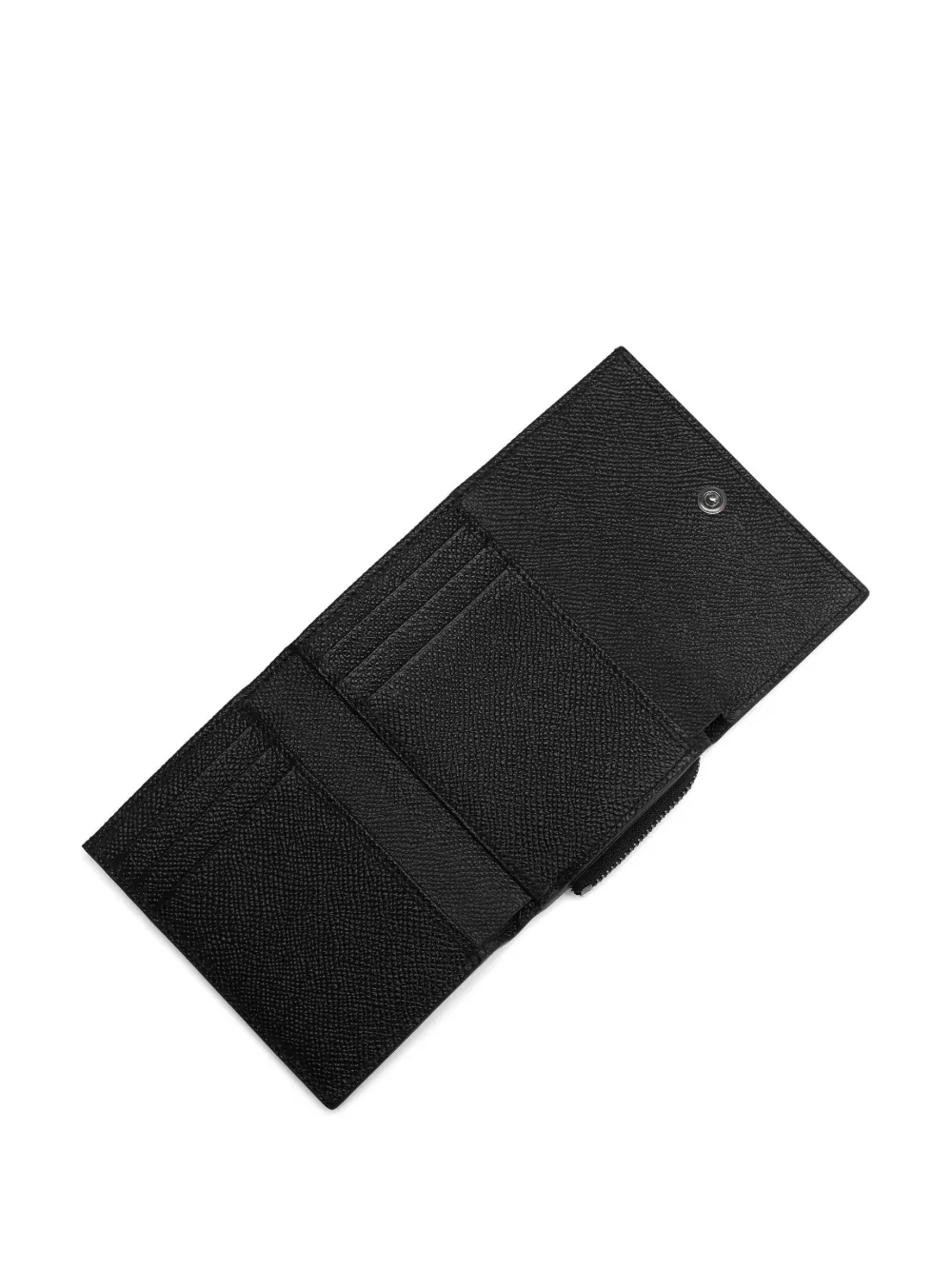 Черный, телячья кожа, серебристый металлический логотип, внутренние отделения для карт, три сложения и карман на молнии сзади.