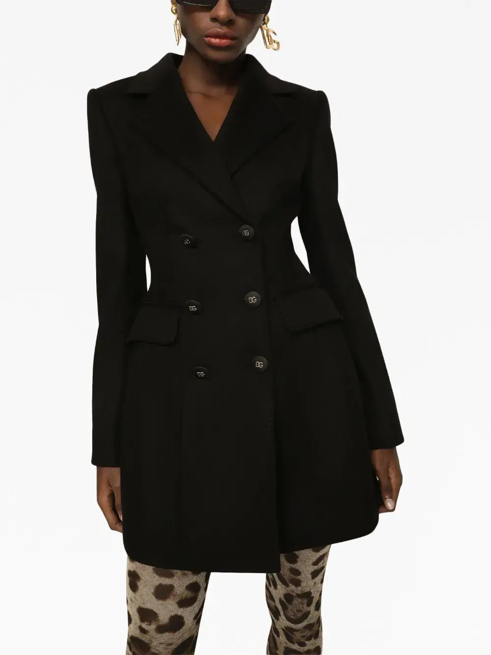 Черный, смесовая необработанная шерсть, пуговицы с тисненым логотипом, широкие зазубренные лацканы, двубортная застежка на кнопки, длинные рукава, манжеты на пуговицах, приталенный силуэт, два передних кармана с клапанами и прямой подол.