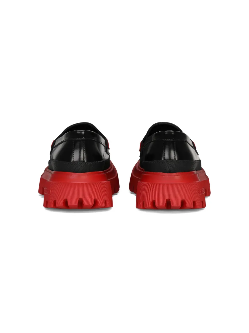 Черный, красный, телячья кожа, декоративная строчка, серебристый металлический логотип, закругленный носок, стелька с логотипом, рифленая резиновая подошва и модель без застежки.