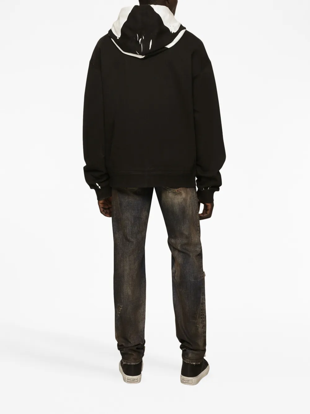 Черный/белый, хлопок, принт с логотипом на груди, застежка на молнии спереди, затягивающийся на шнурок капюшон, длинные рукава и прямой подол.