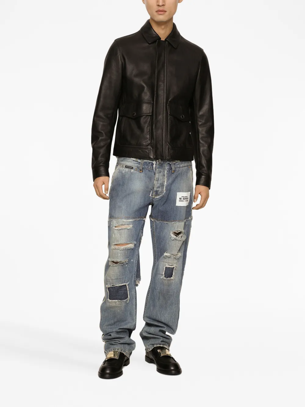 Черный, овечья кожа, классический воротник, потайная застежка спереди, длинные рукава и два передних кармана с клапанами.