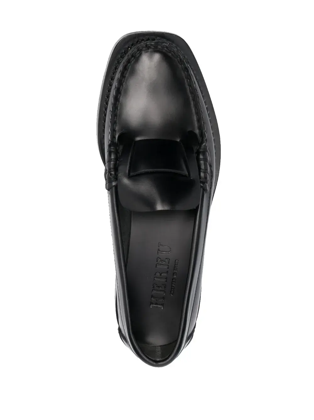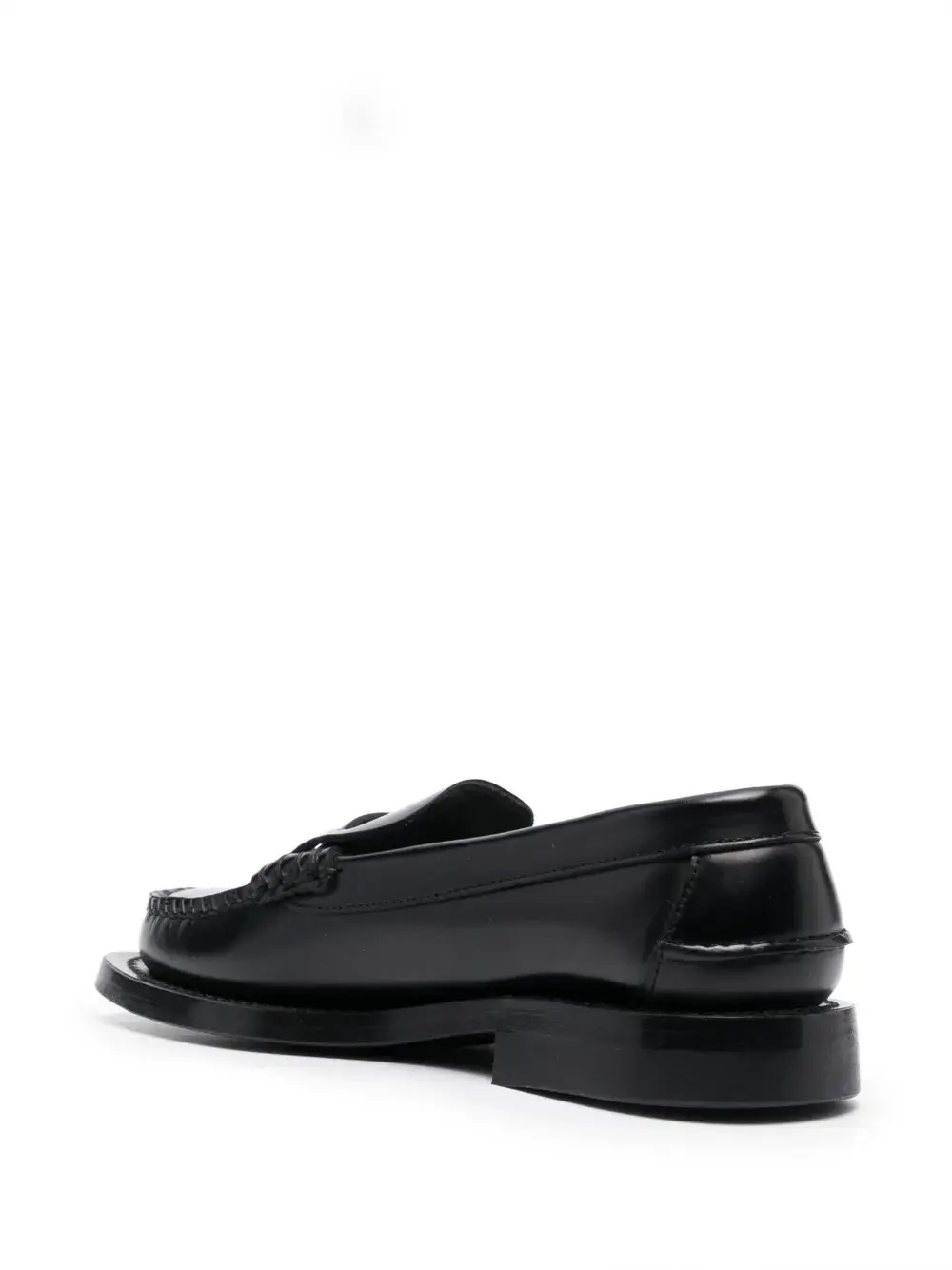 Черный, телячья кожа, кожаная стелька с логотипом, миндалевидный носок, модель без застежки и низкий каблук.