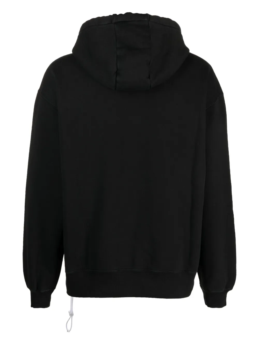 Черный, хлопок, логотип спереди, затягивающийся на шнурок капюшон, карман-муфта, длинные рукава и подол с кулиской.