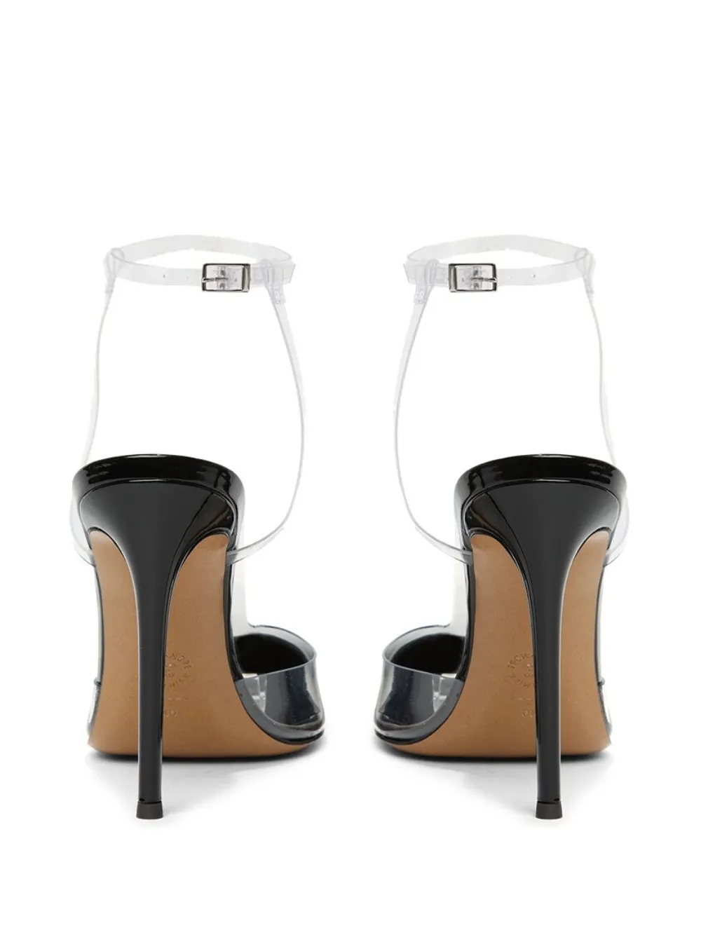 Черный, прозрачный материал, кожа, заостренный носок, ремешок на щиколотке с пряжкой, стелька с логотипом и каблук на высокой шпильке.