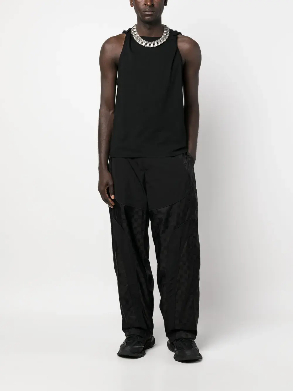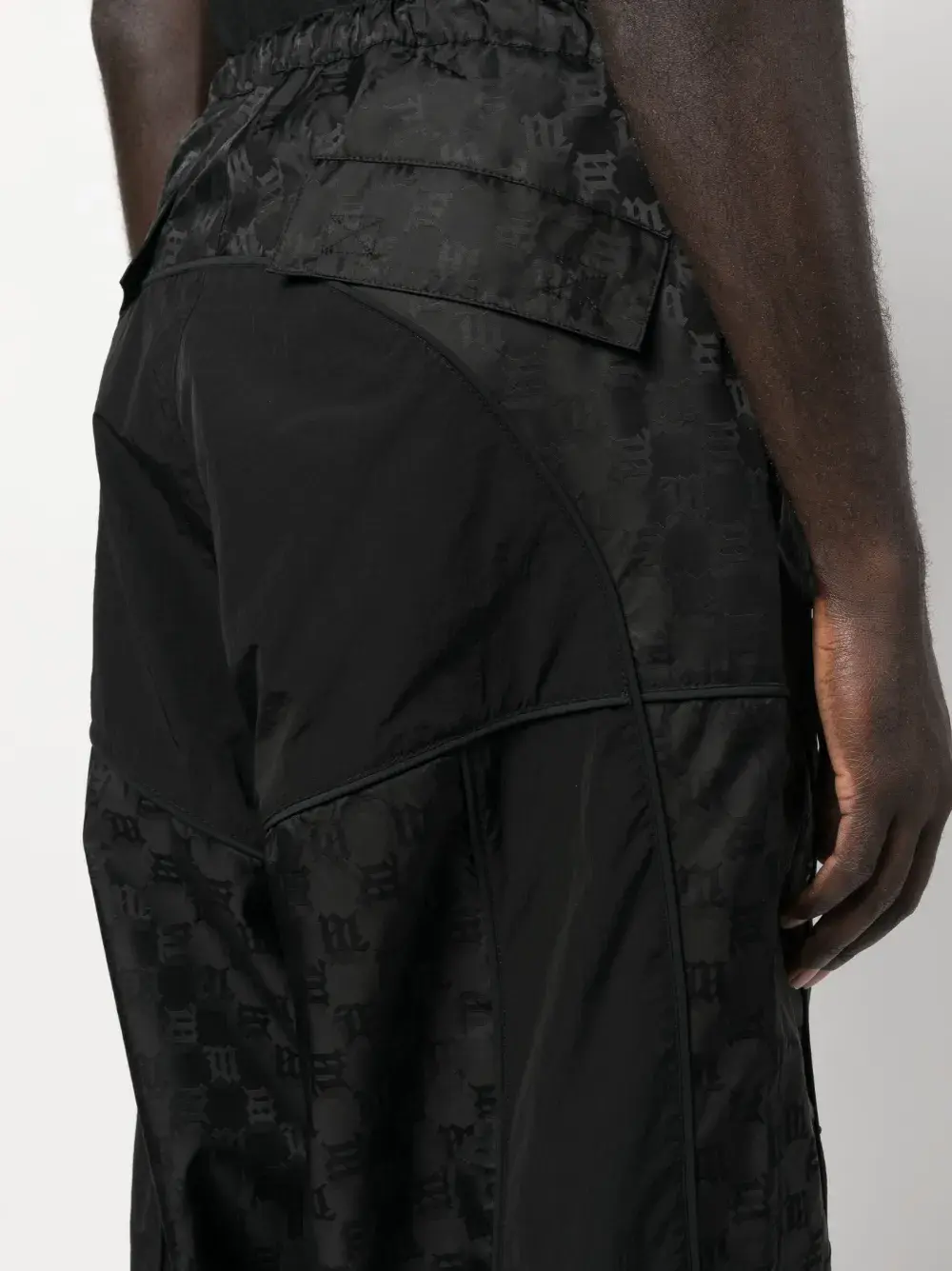 Черный, жаккард с монограммой, кулиска на талии, вставки, два кармана с клапанами по бокам, два кармана с клапанами сзади, широкий крой и резинки с фиксаторами.