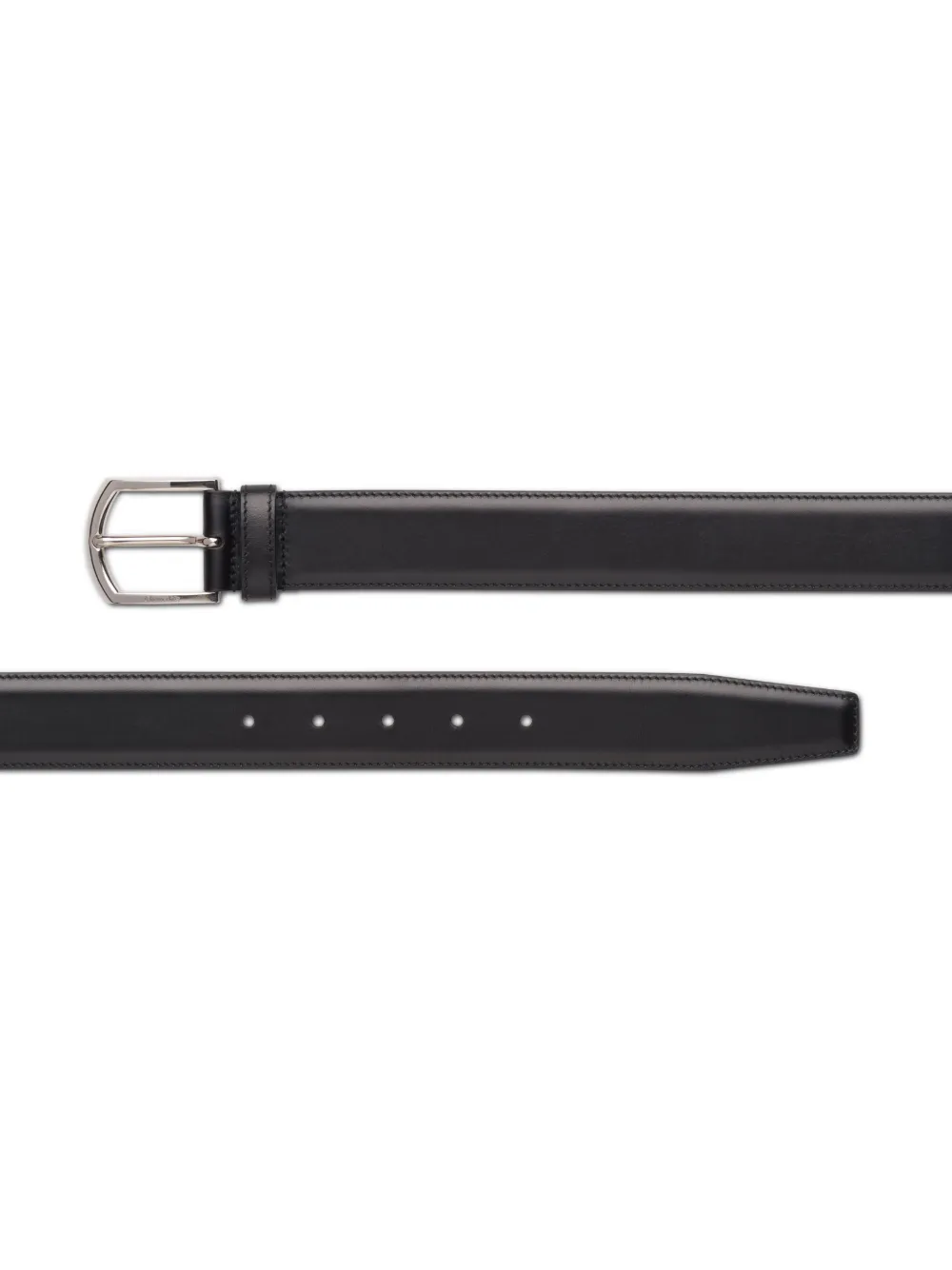 Черный, телячья кожа, серебристая фурнитура, глянцевая фактура, застежка с D-образной пряжкой, прорезанные отверстия и регулируемый дизайн.