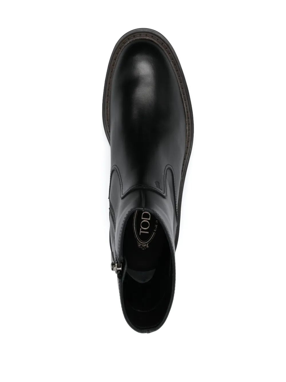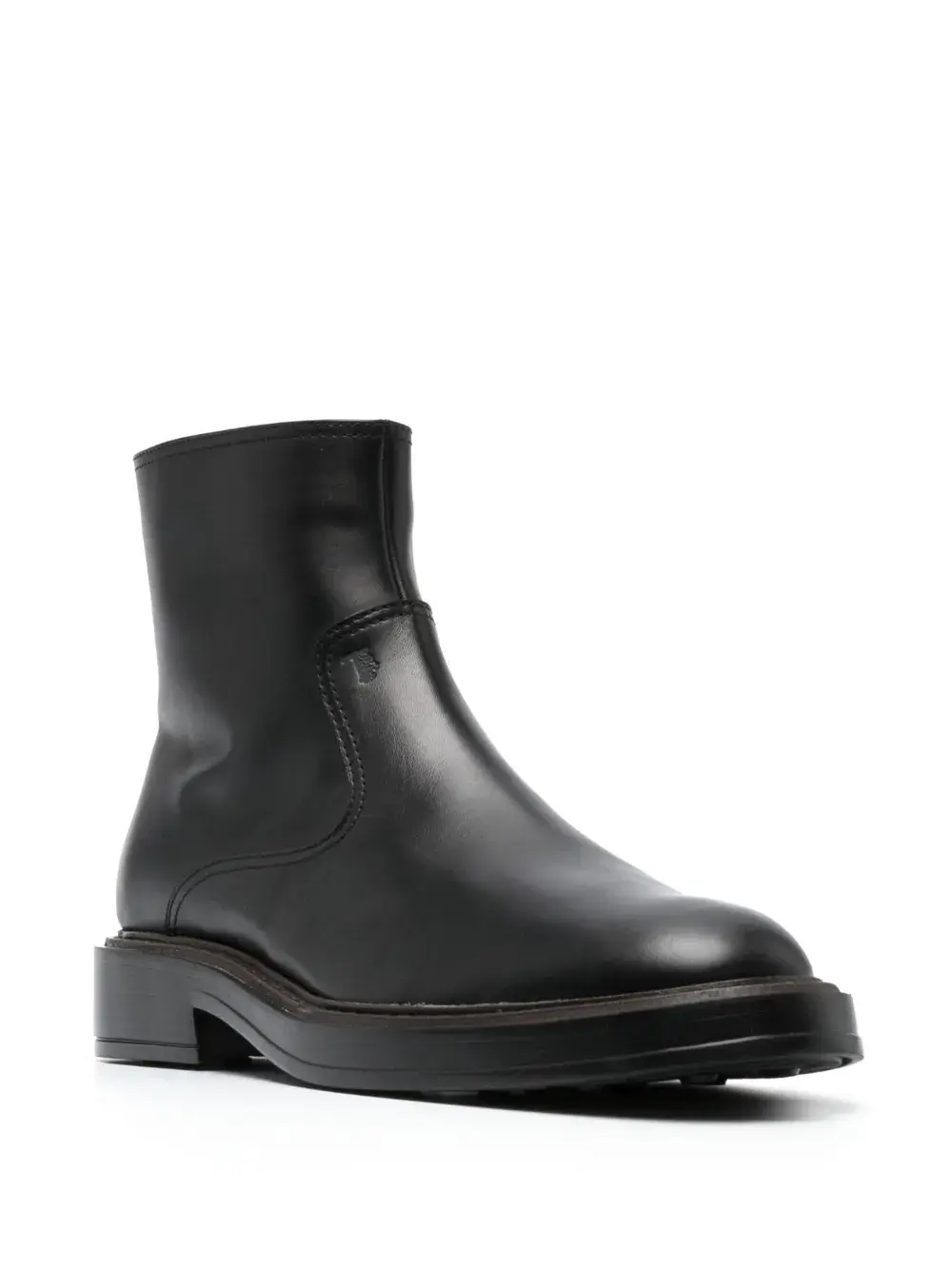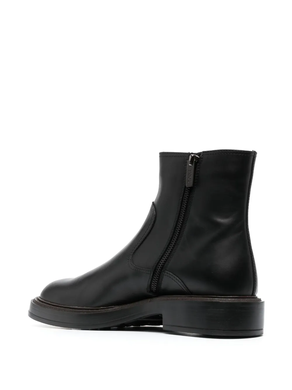 Черный, телячья кожа, гладкая текстура кожи, контрастные вставки, тисненый логотип спереди, строчка в тон, миндалевидный носок, застежка на молнии сбоку, низкий блочный каблук, кожаная стелька с логотипом и плоская резиновая подошва.