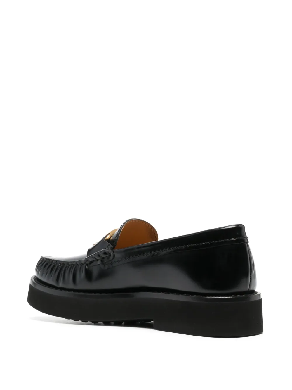 Черный, телячья кожа, золотистый металлический логотип, кожаная стелька с логотипом и низкий блочный каблук.