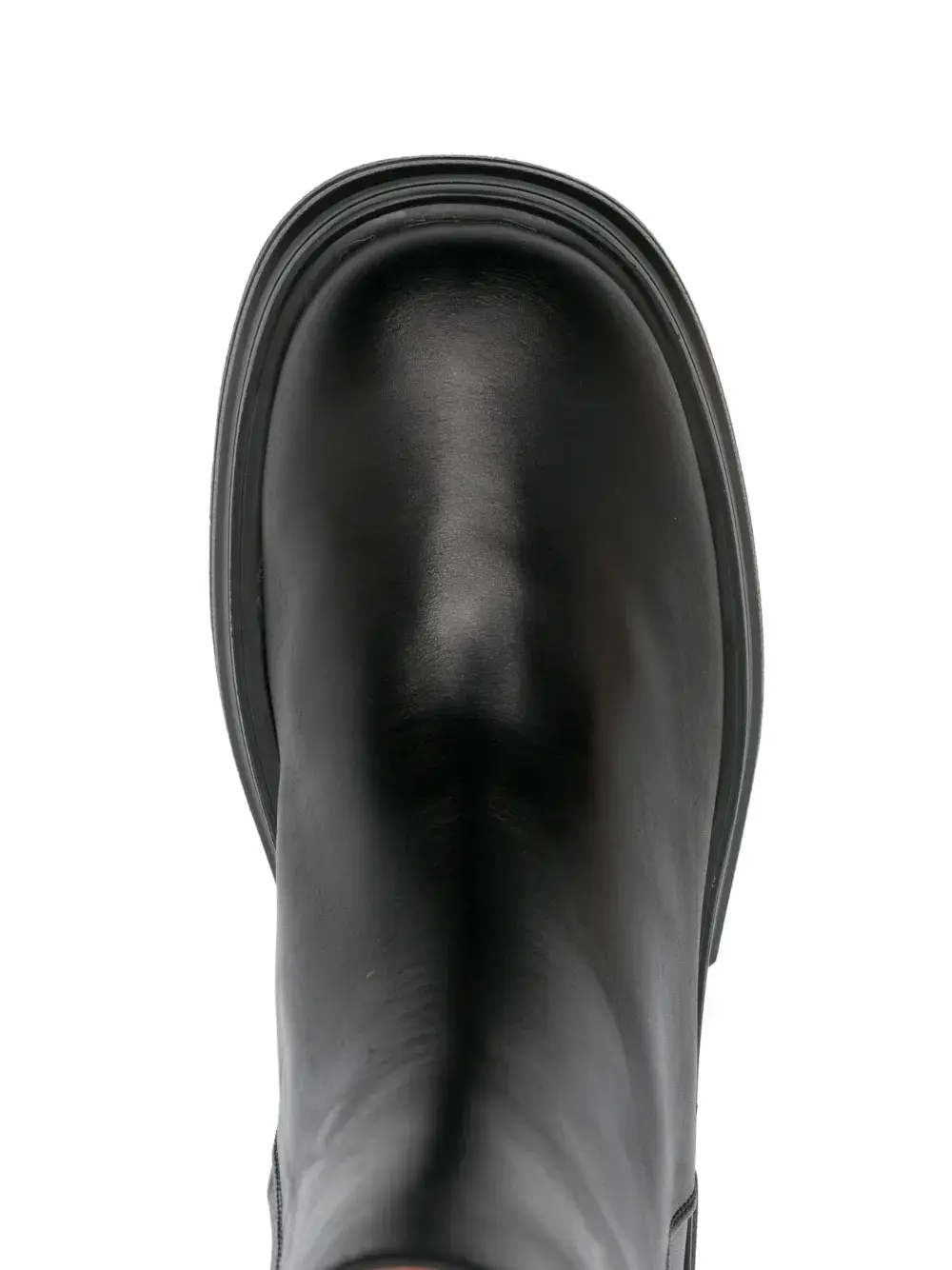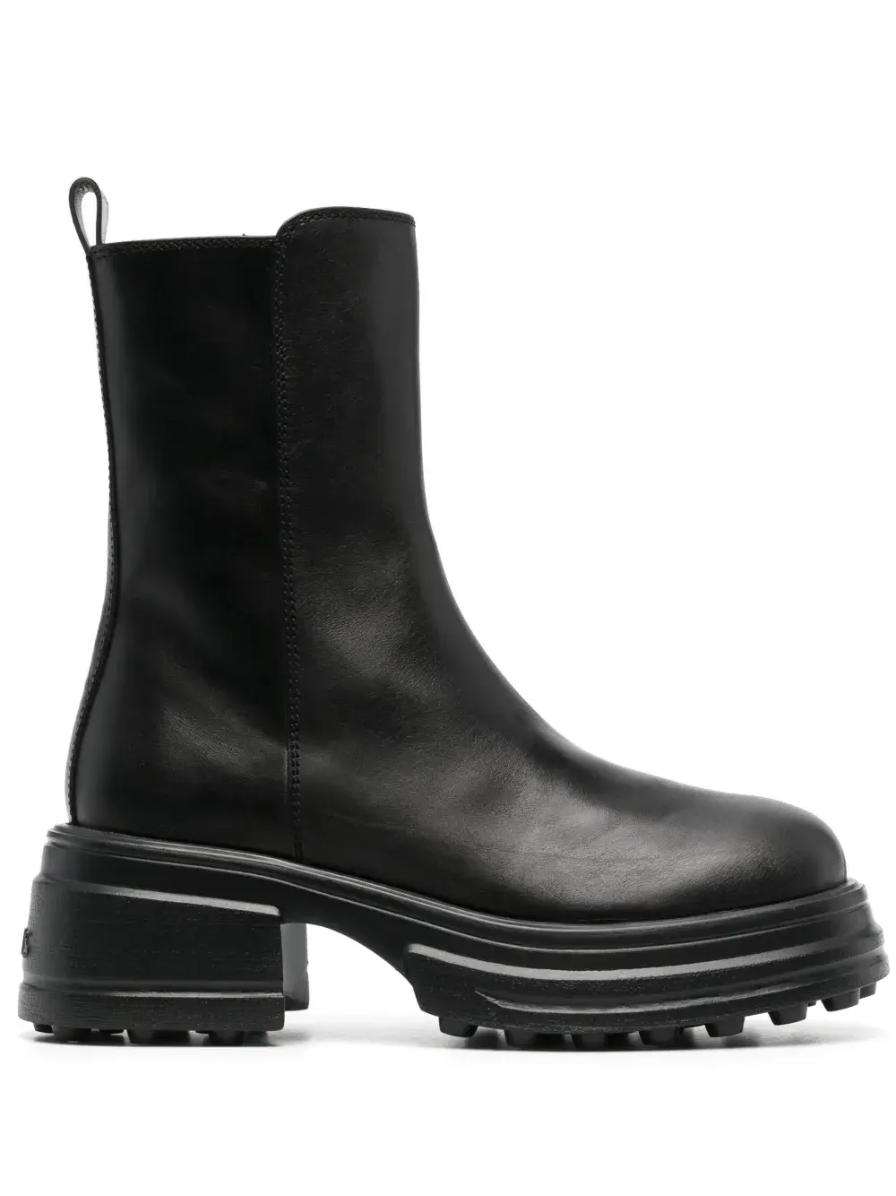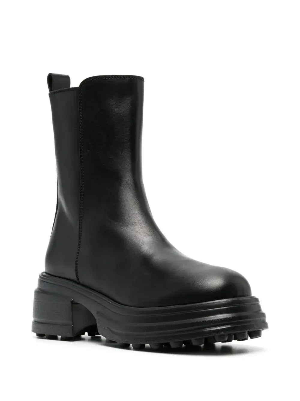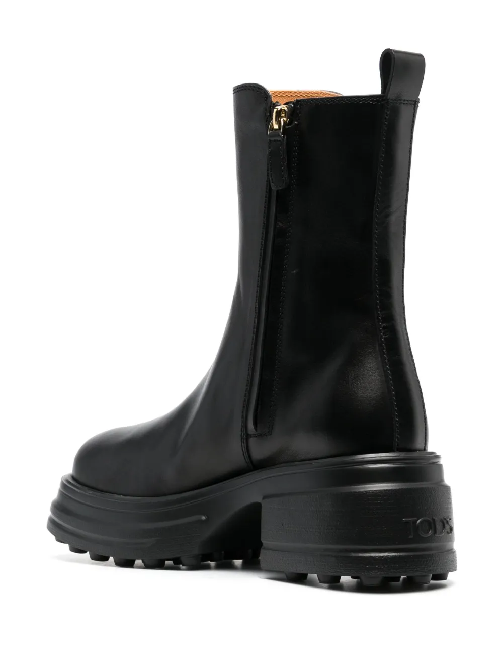 Черный, телячья кожа, закругленный носок, застежка на молнии сбоку, высота по щиколотку, рифленая резиновая подошва и каблук средней высоты.