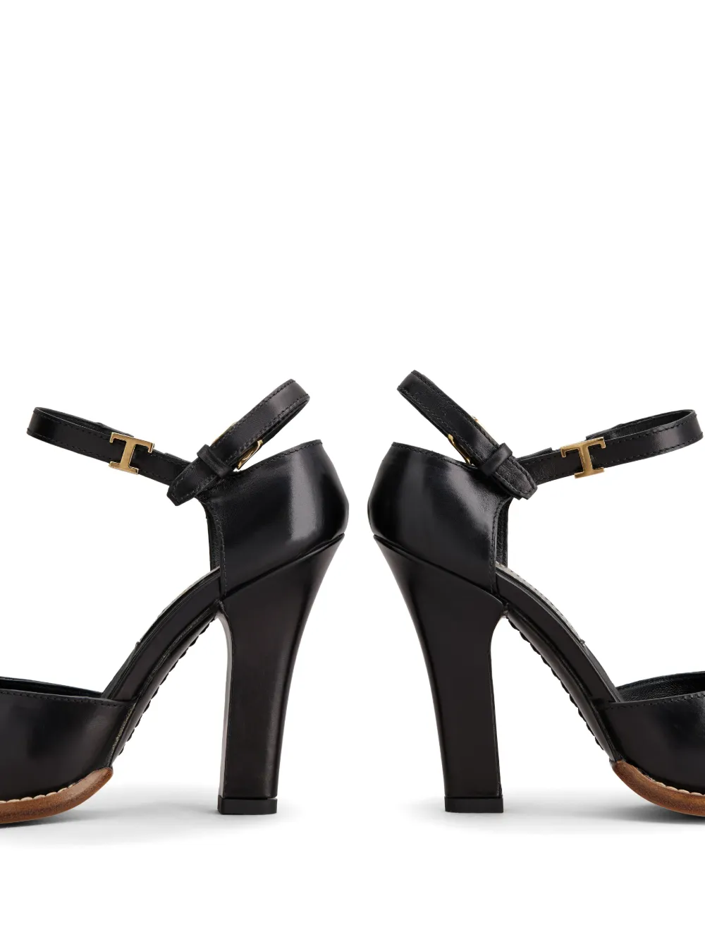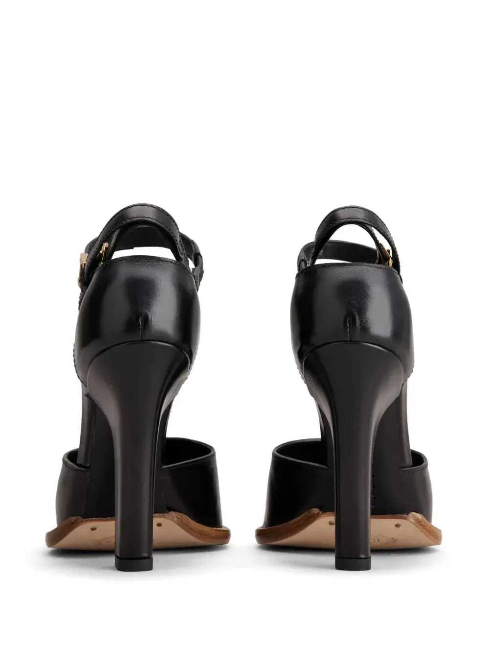 Черный, кожа, металлический логотип, ремешок на щиколотке с пряжкой, миндалевидный носок, стелька с логотипом и высокий каблук.