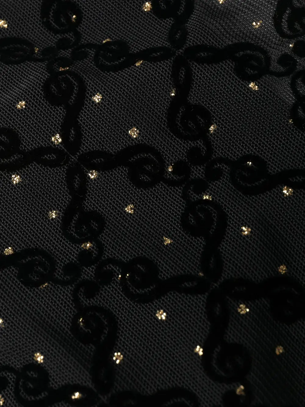 Черный, люрекс, ткань с эффектом деворе, кружевные вставки и стринги. Эту вещь можно примерить, но только поверх собственного белья. Узнать больше о том, какие товары получают отметку «Ответственный выбор», можно из материала «Как мы оцениваем экологичность и этичность».