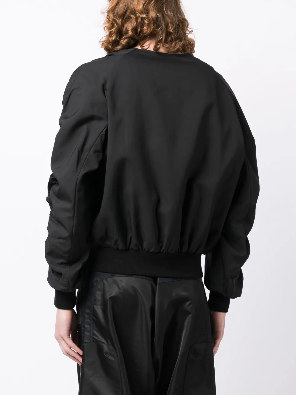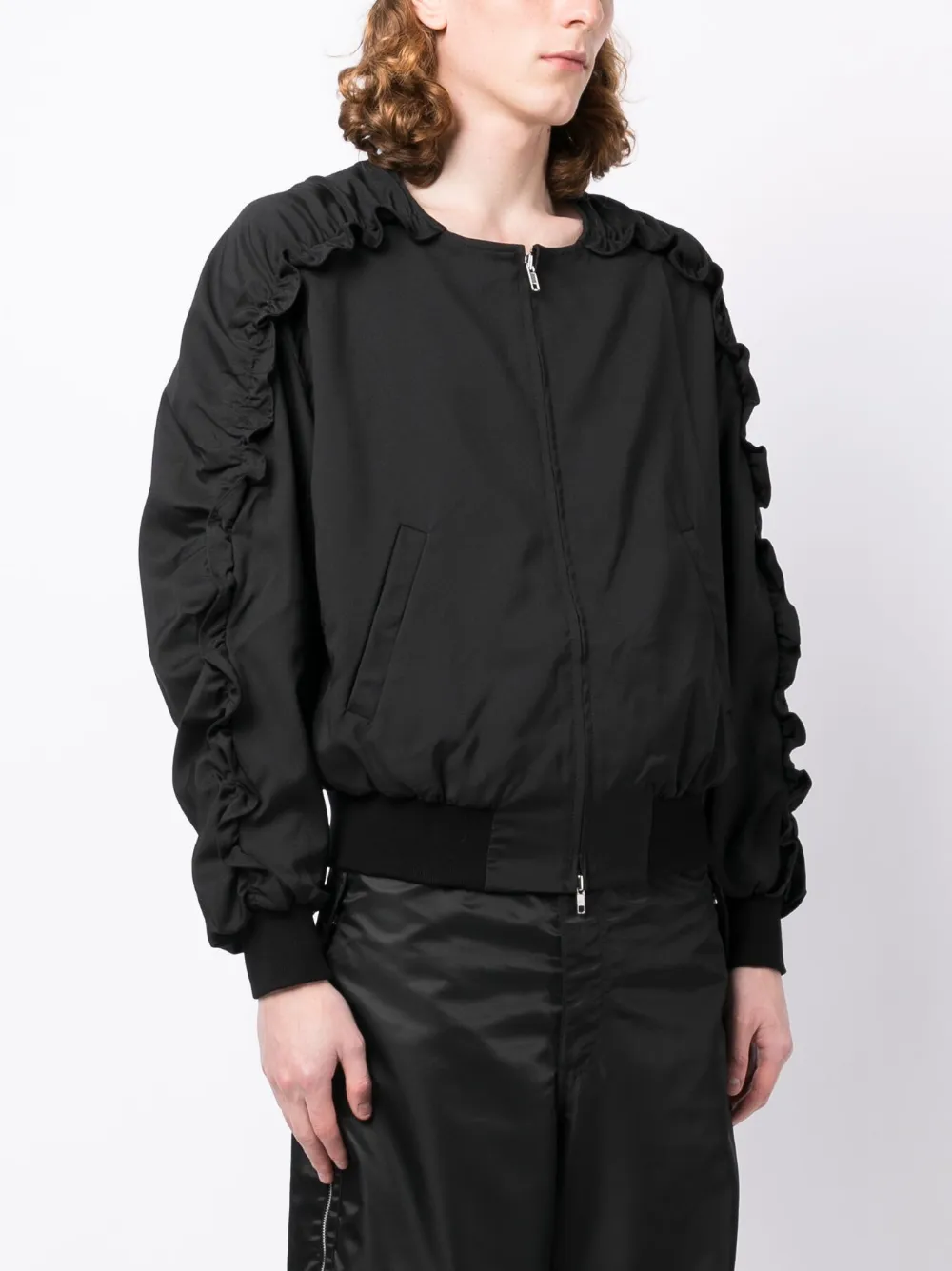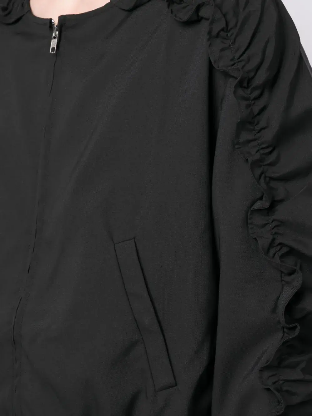 Черный, детали с оборками, круглый вырез, двусторонняя молния спереди и длинные рукава.