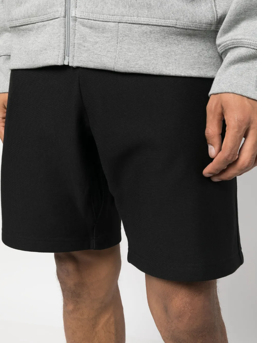 Черный, смесовый хлопок, вышитый логотип сбоку, кулиска на талии, прямой крой, два прорезных кармана по бокам, накладной карман сзади и длина по колено.
