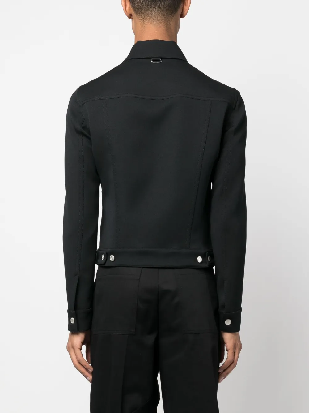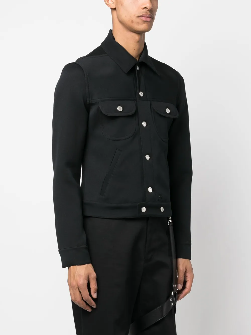 Черный, хлопок, классический воротник, застежка на пуговицах спереди, два нагрудных кармана с клапанами, два прорезных кармана по бокам, длинные рукава и прямой подол.