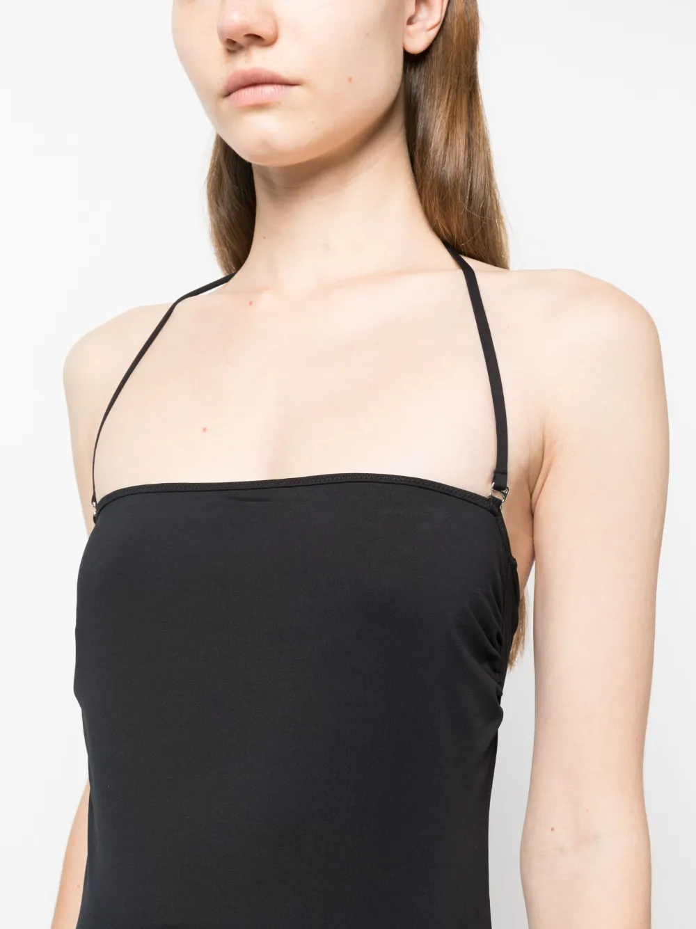 Черный, эластичный материал, регулируемый дизайн, без рукавов, завязки вокруг шеи и длина до бедер.
