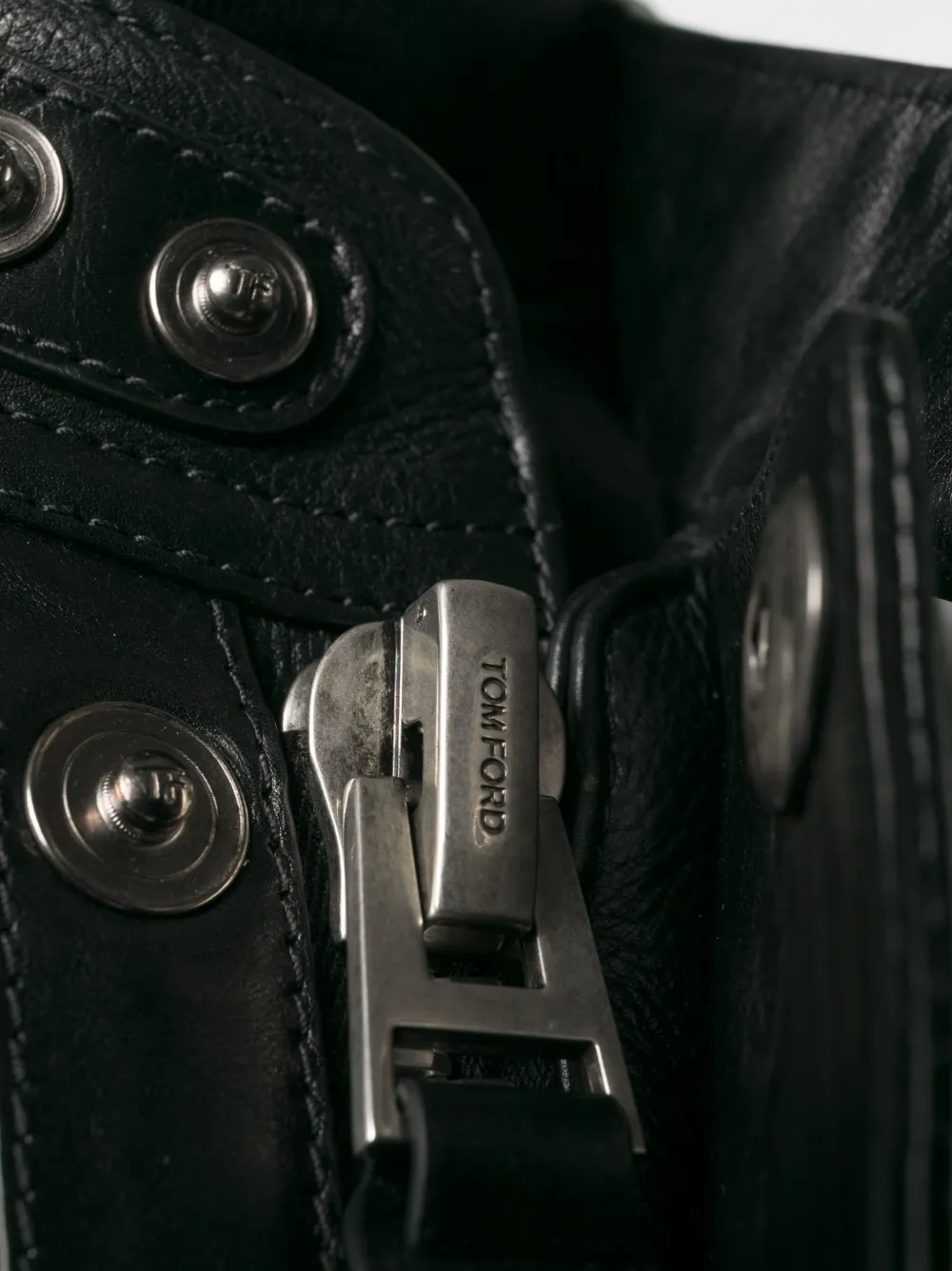 Черный, телячья кожа, воротник на пуговицах, потайная молния спереди, застежка на кнопках спереди, длинные рукава, манжеты на молнии и четыре передних кармана с клапанами.