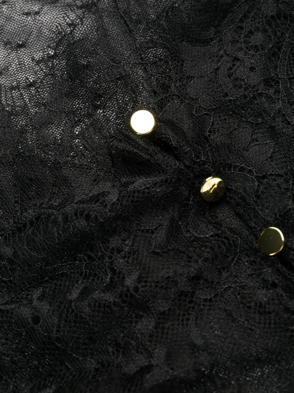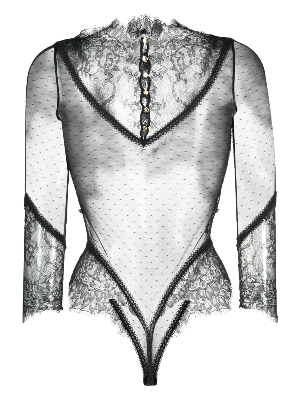 Черный, сетчатая ткань в горошек, вставки из цветочного кружева, застежка на пуговицы сзади, длинные рукава и стринги.