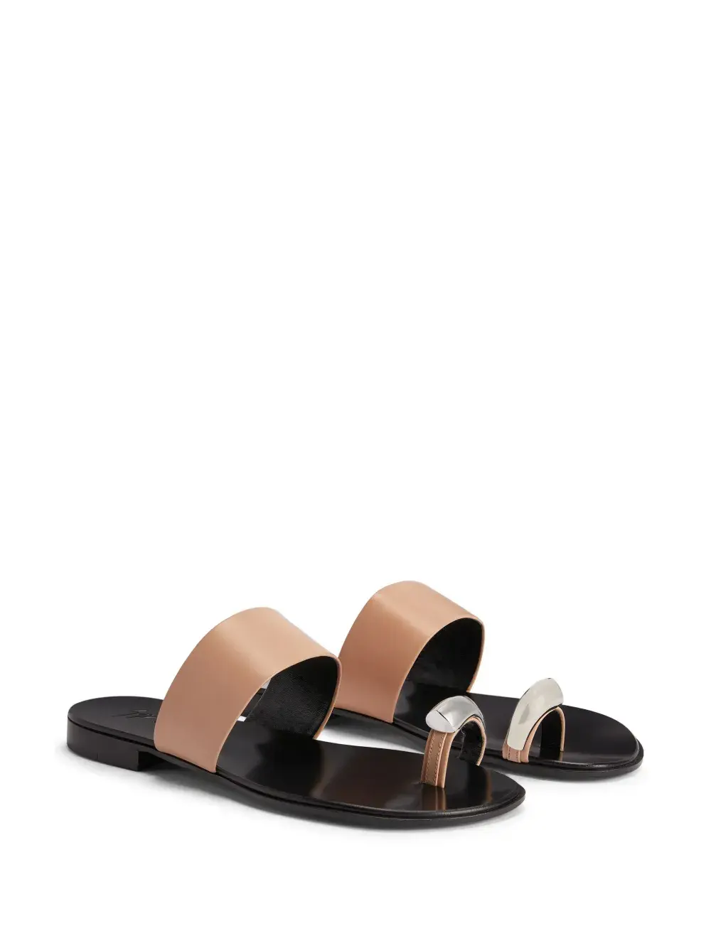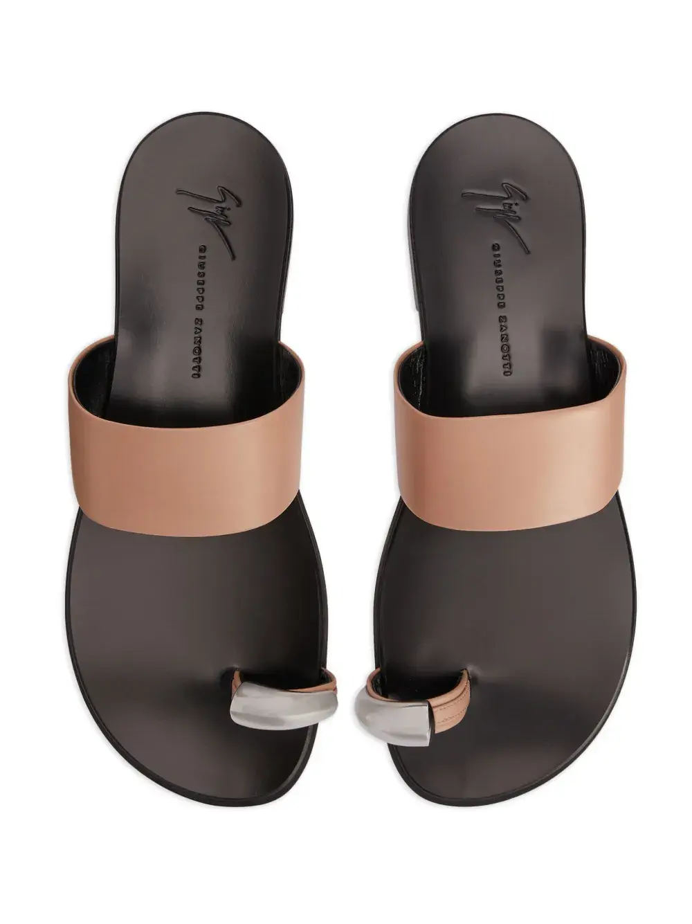 Расцветка Light Brown, черный, кожа, серебристая фурнитура, логотип на стельке, модель без застежки, ремешок на палец и плоская подошва.